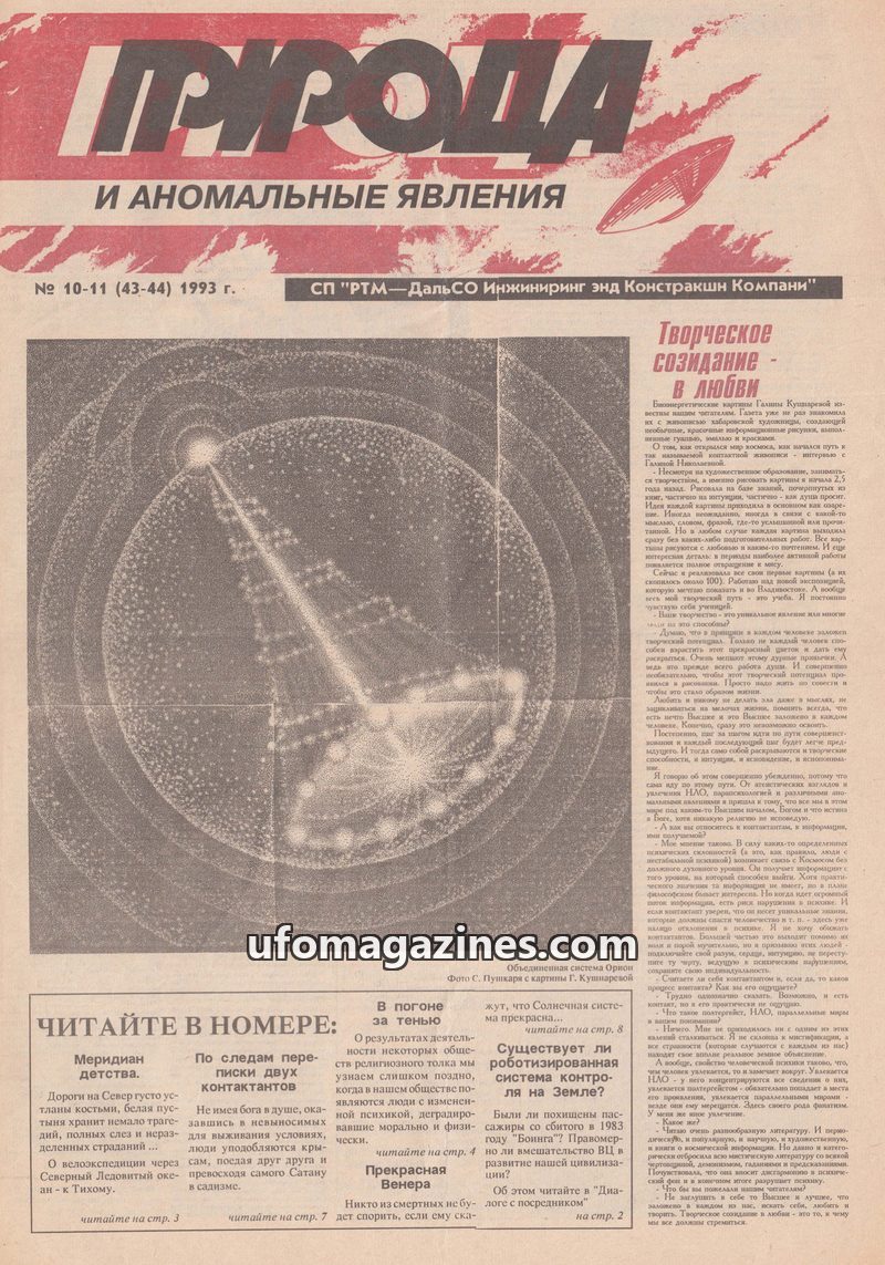 This issue of 'Nature and Anomalous Phenomena' from 1993 delves into various unexplained phenomena. It features an interview with artist Galina Kushnareva about her bioenergetic pa