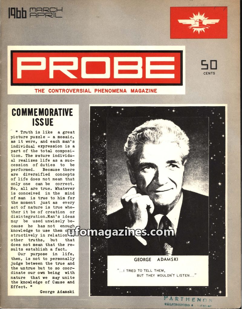 This commemorative issue of Probe Magazine centers on George Adamski, a controversial figure in the UFO community. It highlights his claims about extraterrestrial contact and their