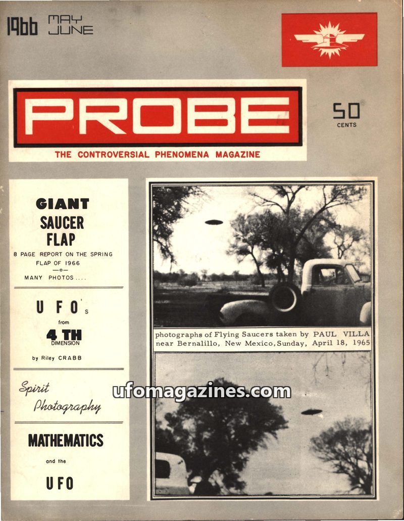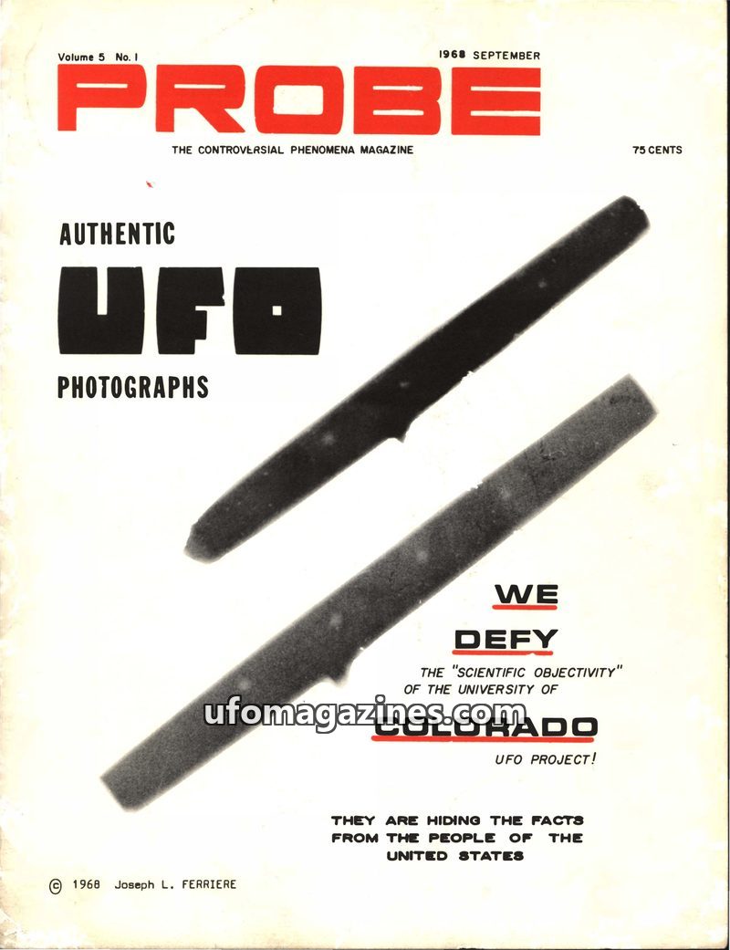 This issue of PROBE Magazine, dated September 1968, focuses on authentic UFO photographs and challenges the scientific objectivity of the University of Colorado's UFO Project. Edit