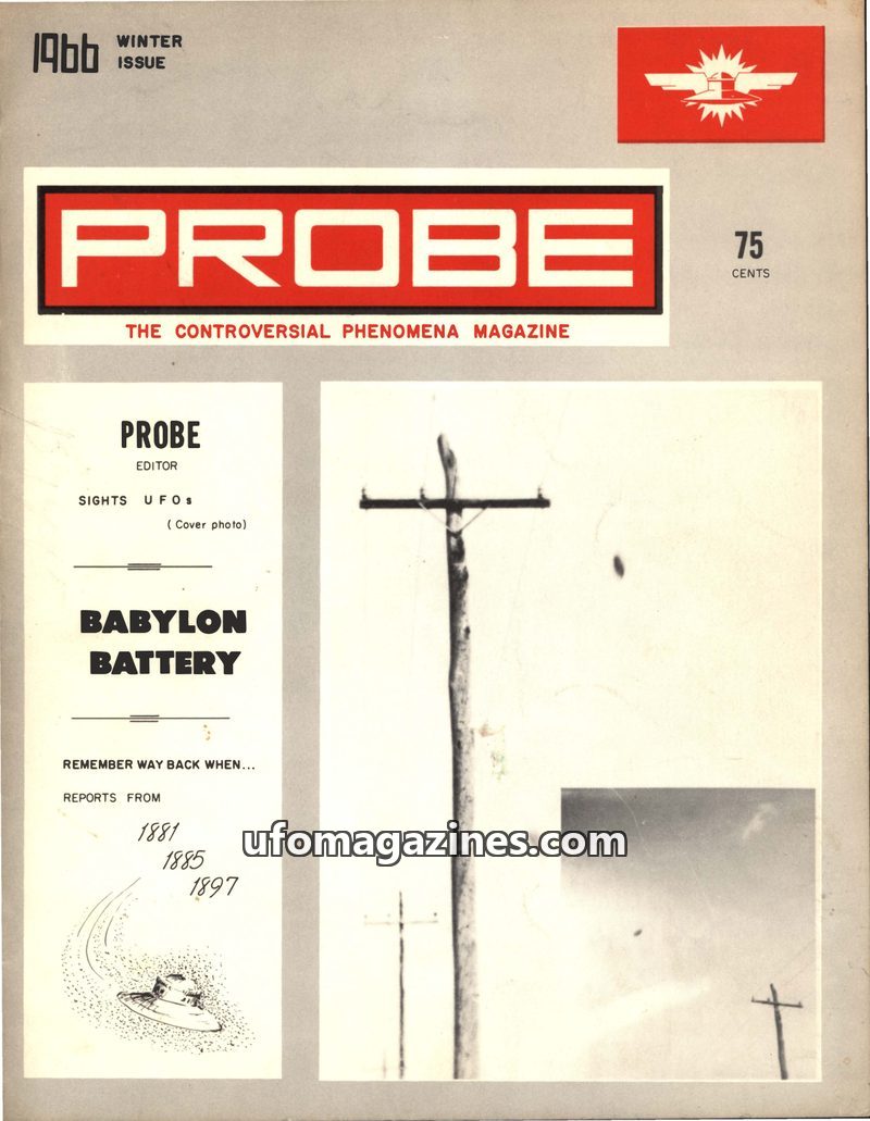 This issue of Probe Magazine, published bimonthly, focuses on UFO sightings prior to 1947 and the connection between flying saucers and power failures. It features reports from var