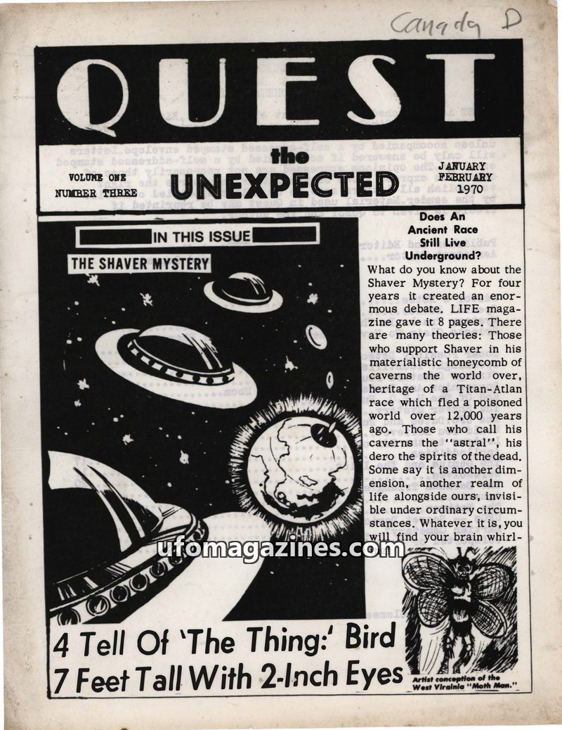 This issue of QUEST magazine from January-February 1970 delves into various mysteries and unexplained phenomena. It features articles on the controversial Shaver Mystery, alleged s