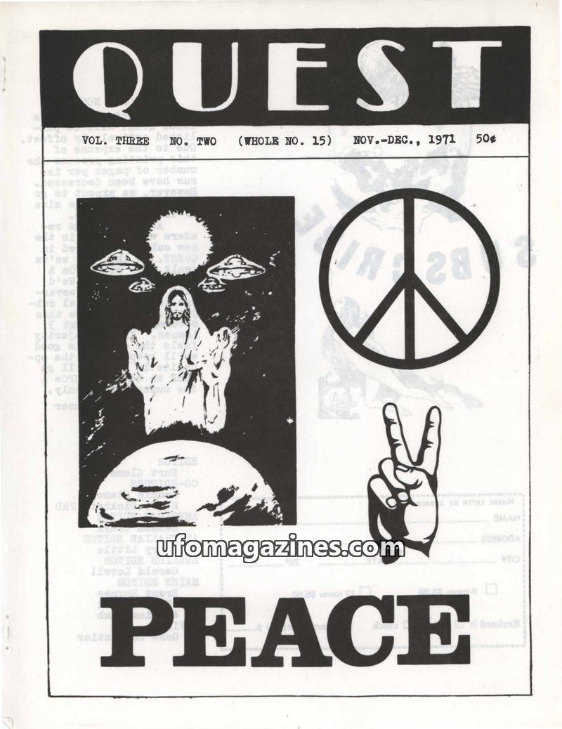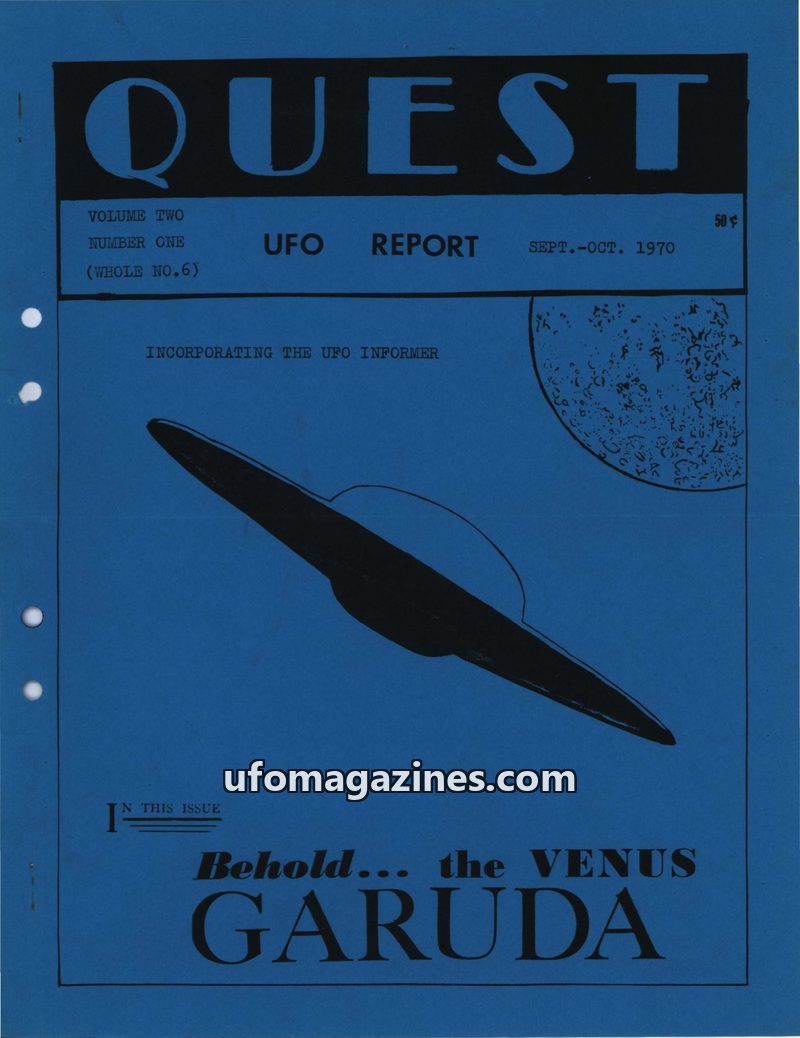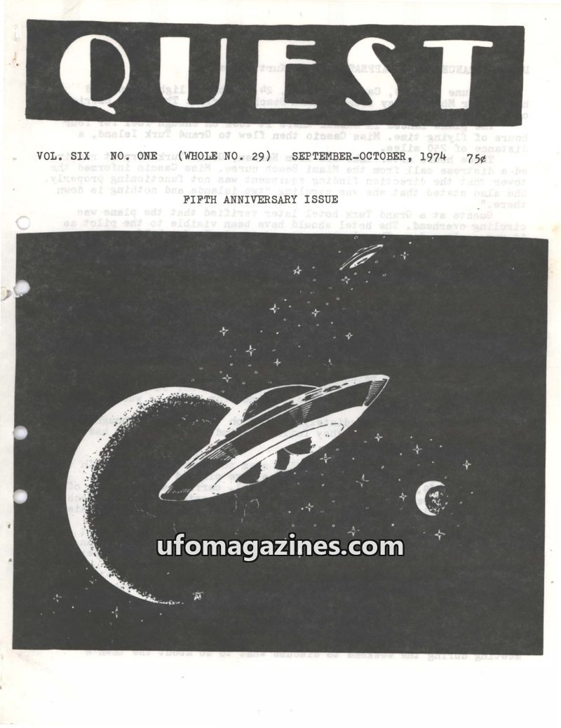 This issue of QUEST UFO REPORT from September-October 1970 covers a variety of paranormal and unexplained phenomena. It includes reports on a supposed "unborn baby" communicating t