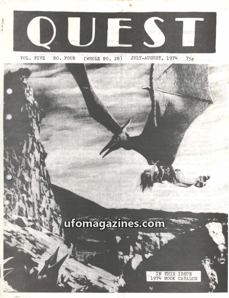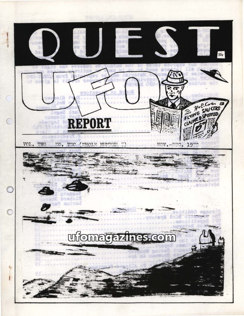 This issue of QUEST-UFO REPORT from Nov-Dec 1970 covers a variety of unusual phenomena. It includes reports of alleged UFO sightings, a mysterious 'Gigantic Bird Mystery' with mult