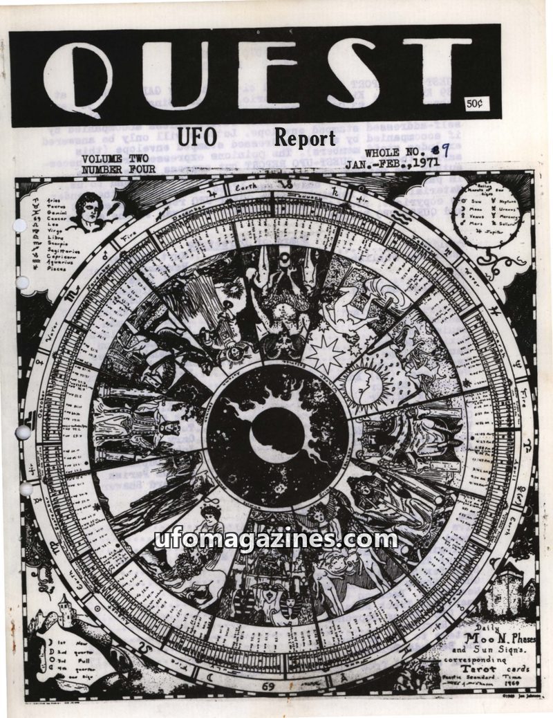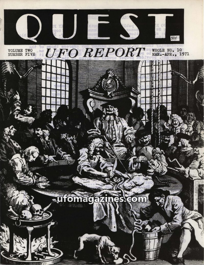 This issue of QUEST UFO REPORT from March-April 1971 covers a range of paranormal topics. It discusses increasing UFO activity, the potential development of electromagnetic field d