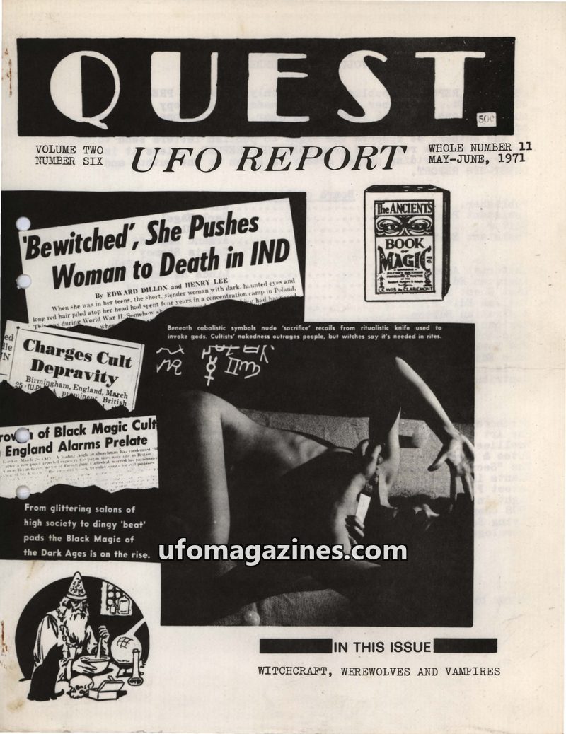 This issue of Quest UFO Report explores the intersection of witchcraft, black magic, and occult practices with UFO phenomena. It details alleged rituals, mind-altering drugs, and h