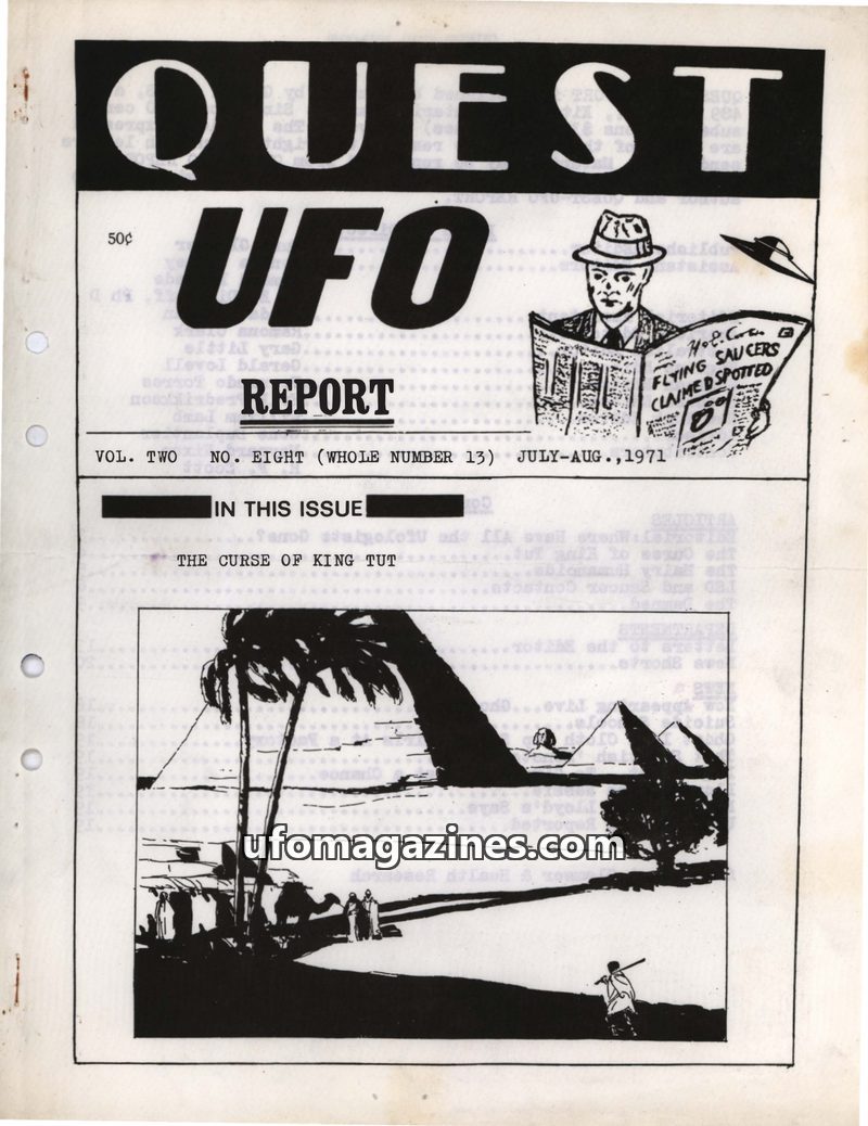This issue of QUEST UFO REPORT from July-August 1971 delves into various unexplained phenomena. It examines the alleged 'curse of King Tut' following the tomb's opening, discusses