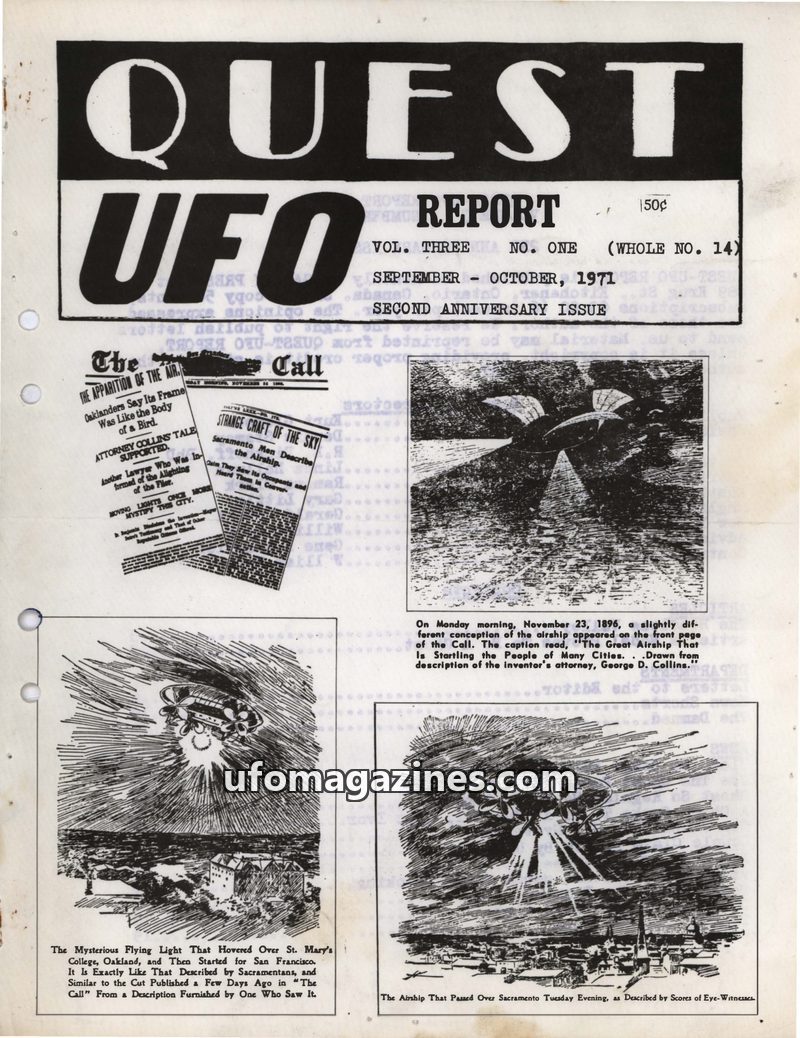This issue of Quest UFO Report covers historical airship sightings from 1896, detailing accounts from Oakland and Sacramento. It delves into the mysterious disappearances and death
