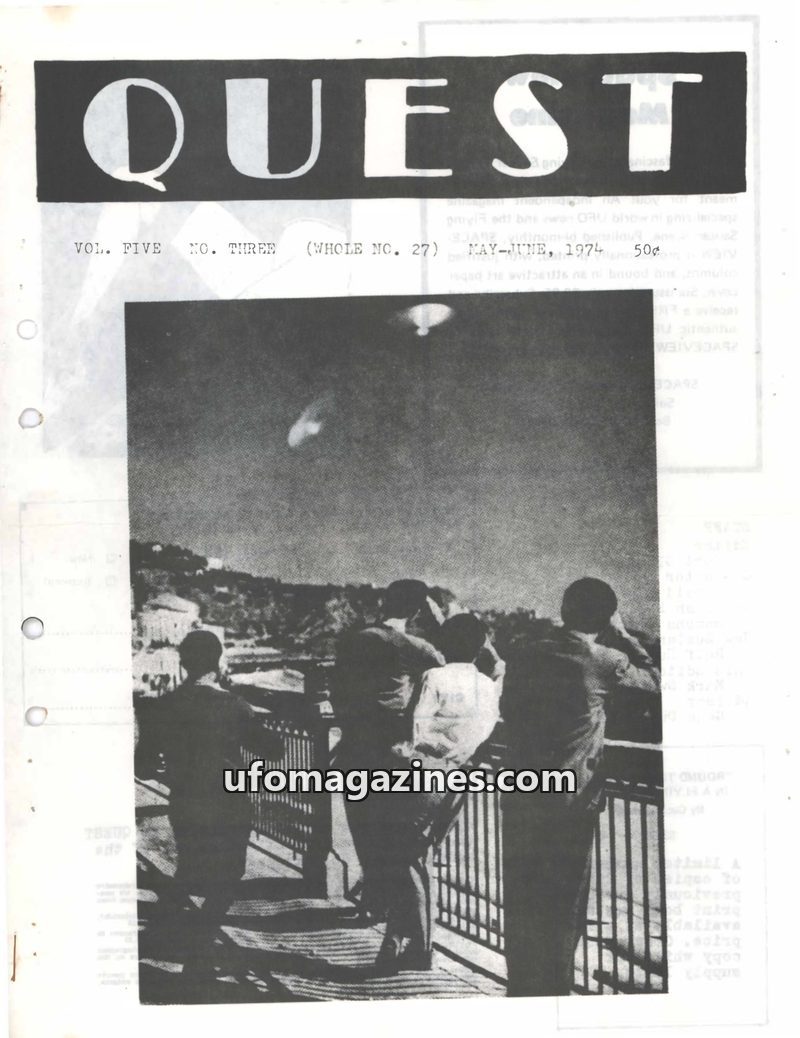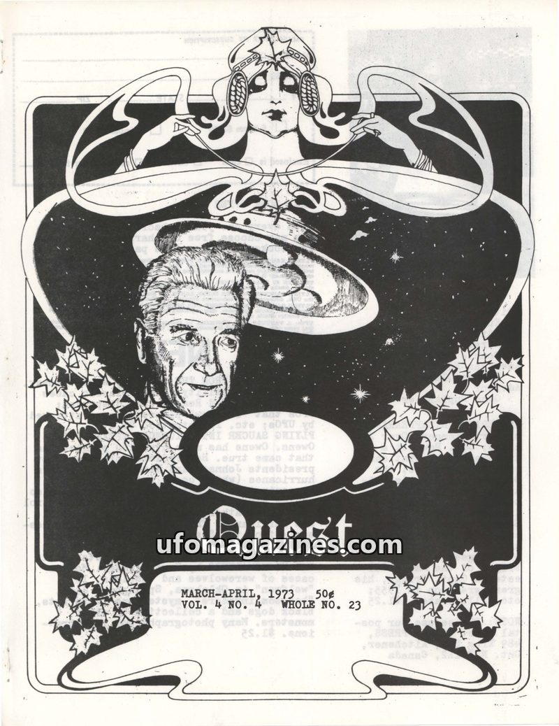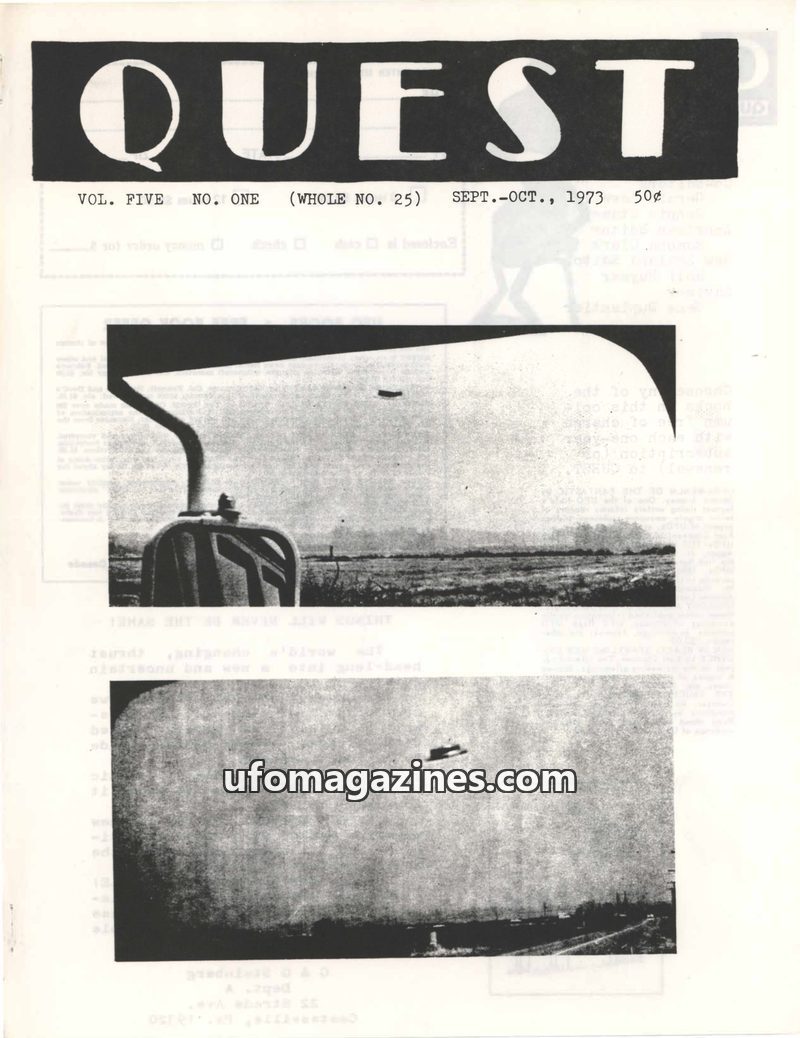 This issue of Quest magazine from March-April 1973 delves into a variety of unexplained phenomena. It reports on UFO sightings in Australia and Kansas, detailing witness accounts a