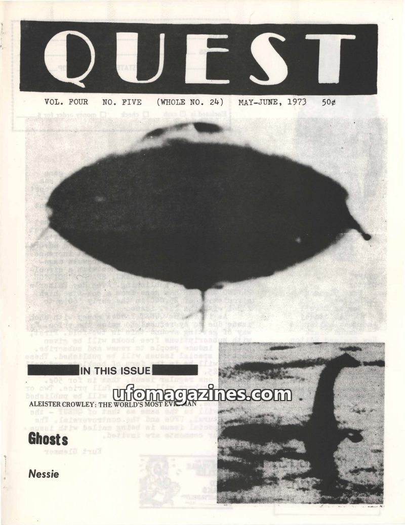 This issue of QUEST magazine, dated May-June 1973, delves into various paranormal and occult topics. It features an in-depth look at the controversial figure Aleister Crowley, deta