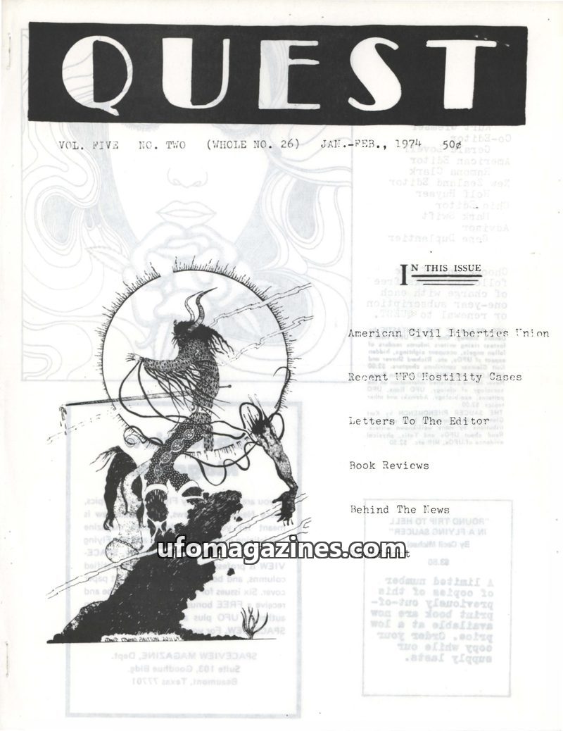 This issue of QUEST magazine, dated Jan-Feb 1974, delves into various topics including recent UFO hostility cases, the role of the American Civil Liberties Union (ACLU) in defendin