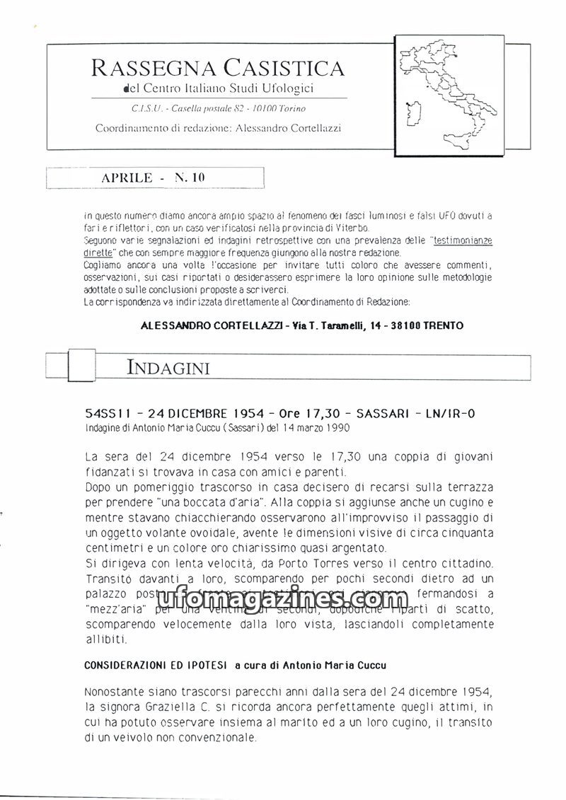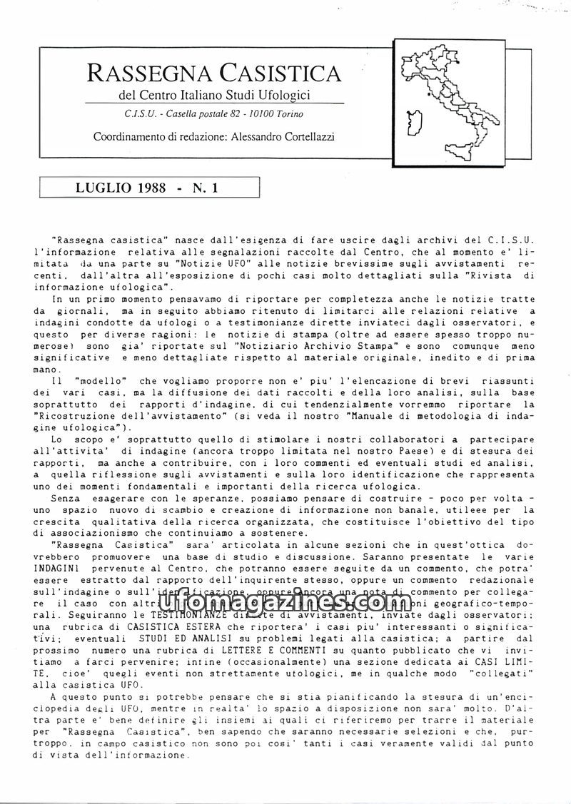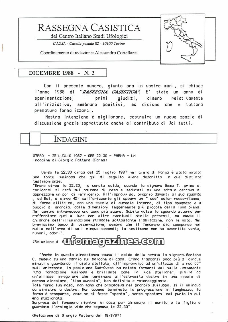 This issue of Rassegna Casistica focuses on UFO sightings in Italy, with detailed case studies from various regions. It includes descriptions of luminous objects, their behavior, a