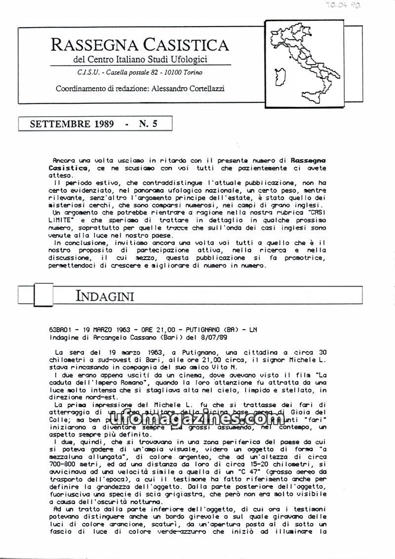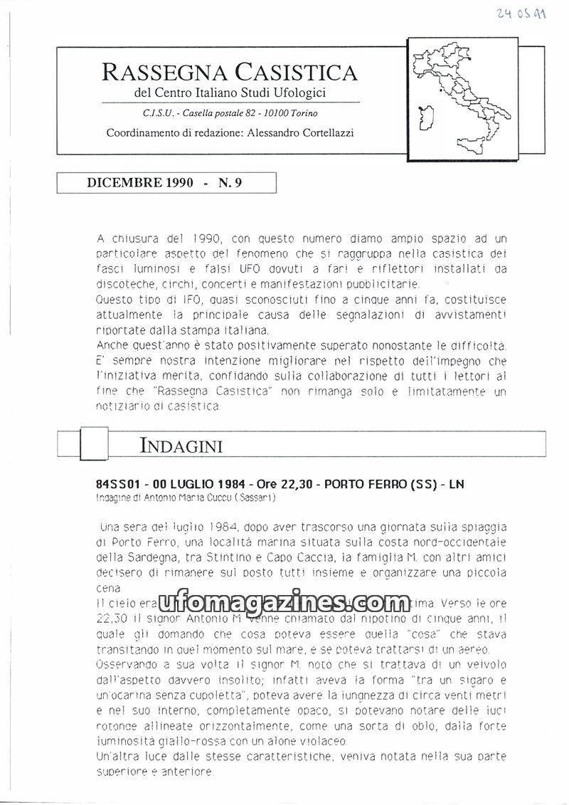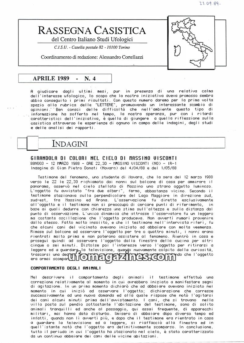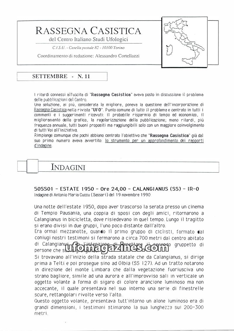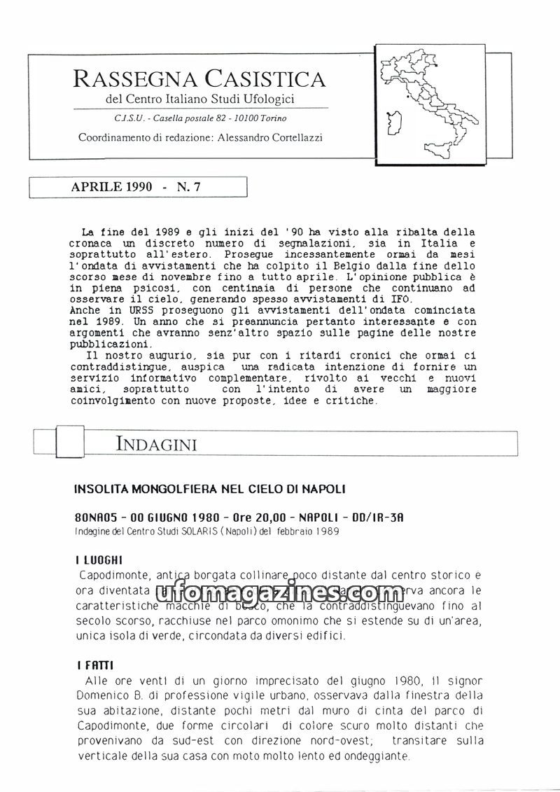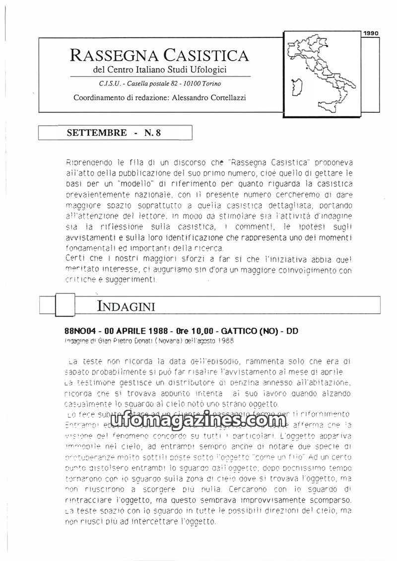 This issue of Rassegna Casistica focuses on detailed investigations of UFO sightings across Italy from the late 1980s and early 1990s. It presents multiple witness accounts of vari