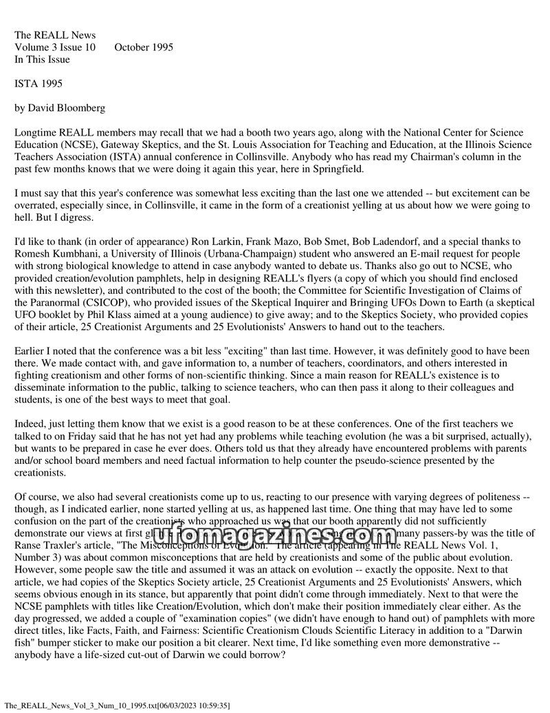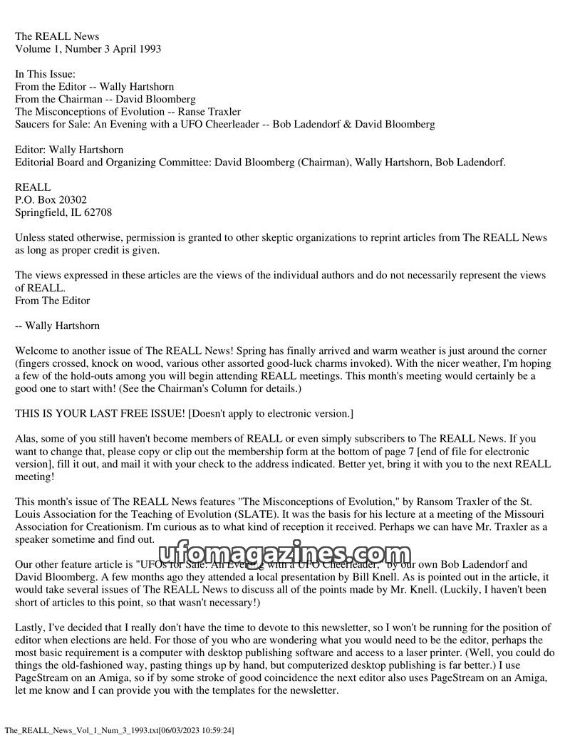 This issue of The REALL News features an article debunking common misconceptions about evolution, arguing it is a valid scientific theory. It also critically reviews a UFO presenta