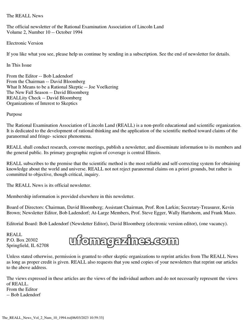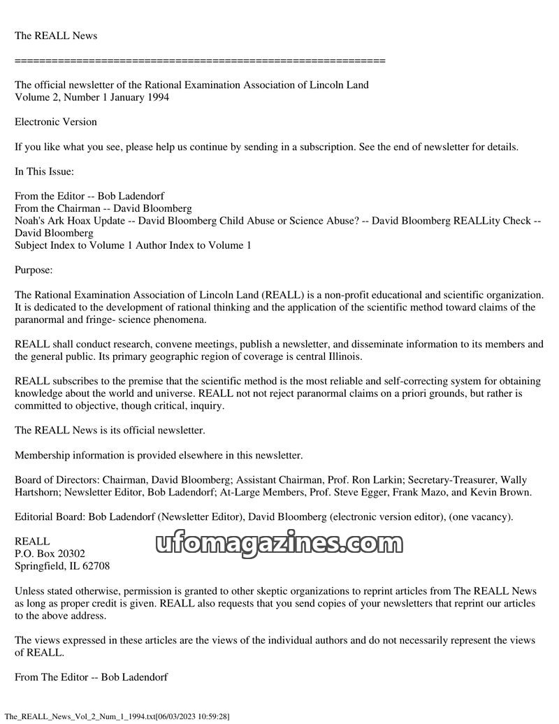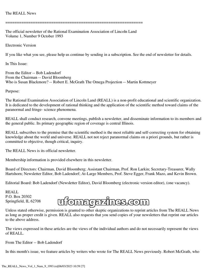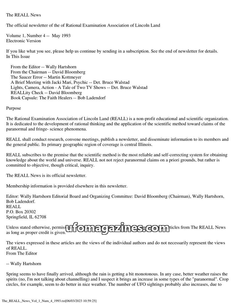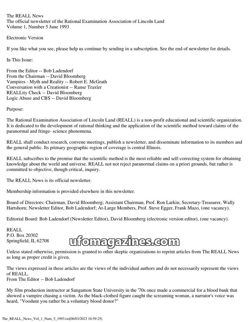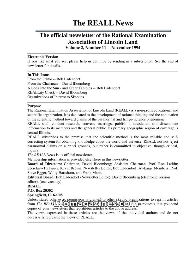 This issue of The REALL News, published by the Rational Examination Association of Lincoln Land (REALL), focuses on rational inquiry into paranormal and fringe science phenomena. I