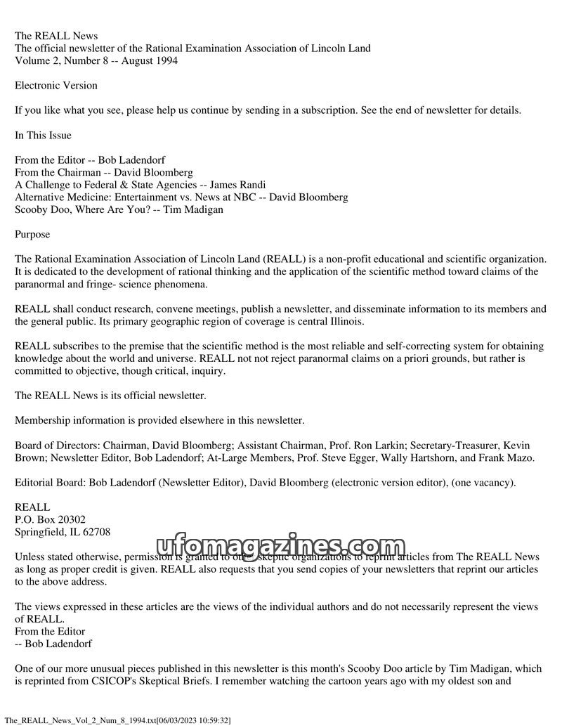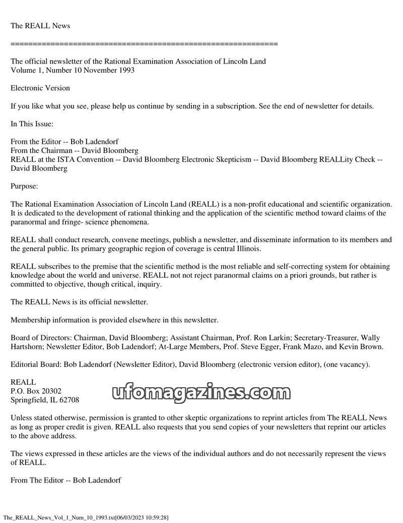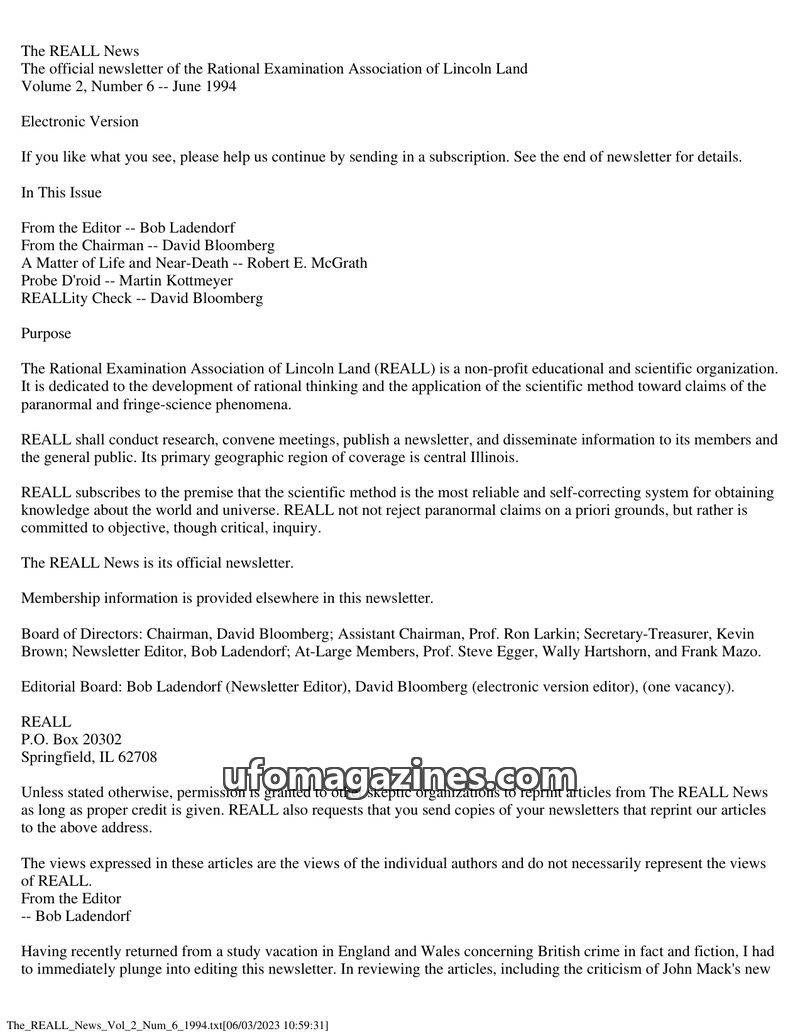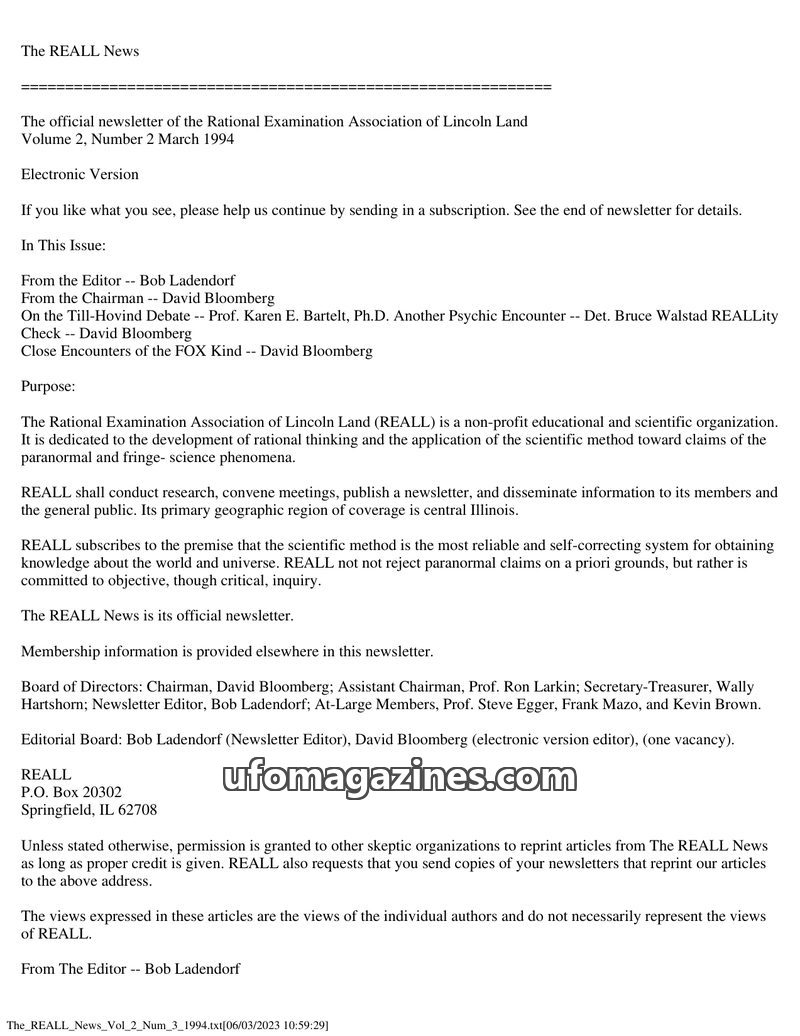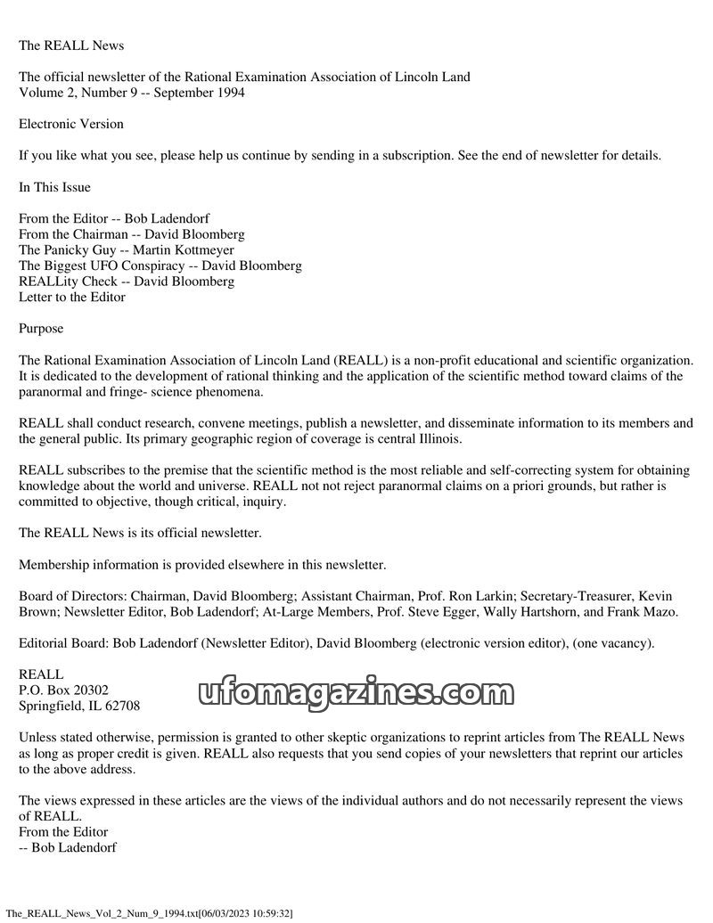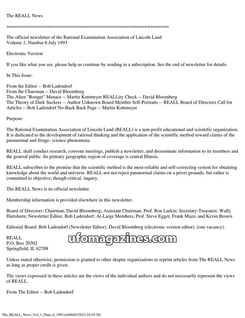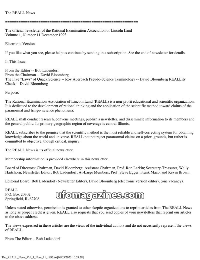 This issue of The REALL News, published by the Rational Examination Association of Lincoln Land (REALL), focuses on rational inquiry into paranormal and fringe science phenomena. I