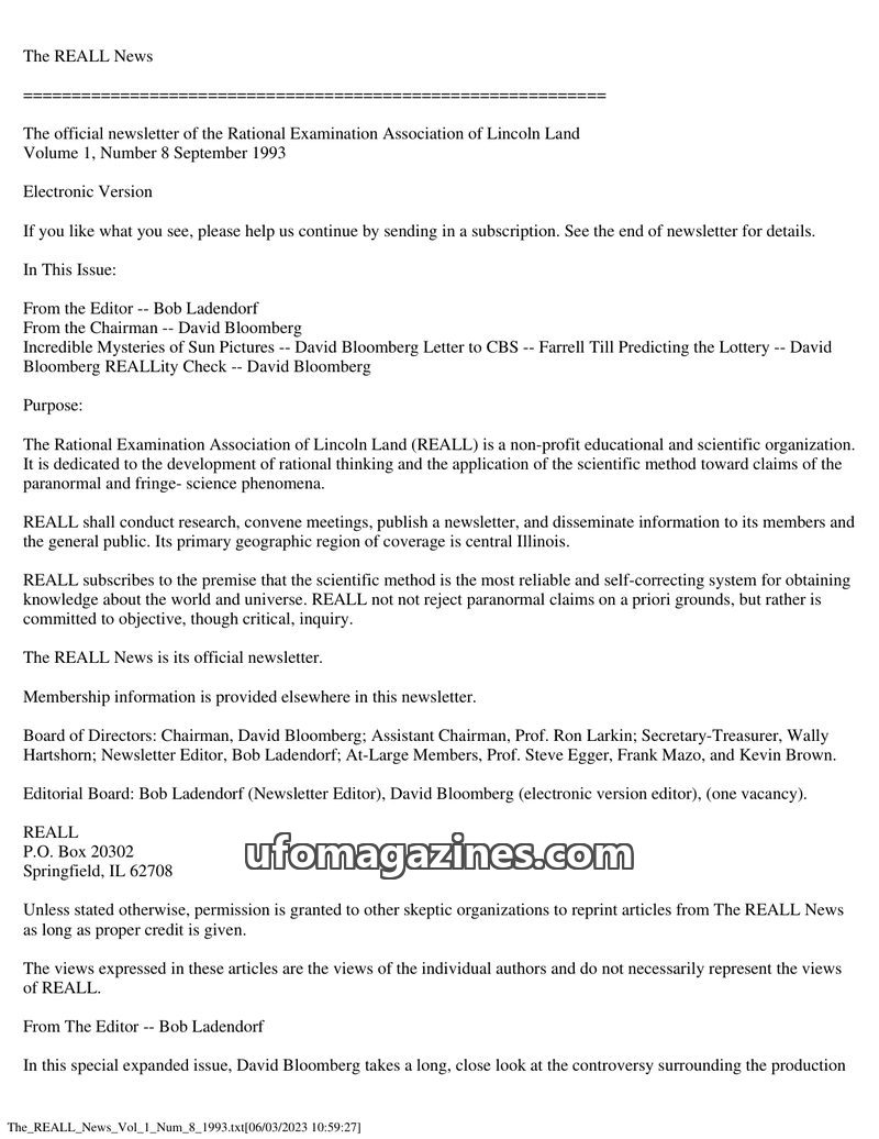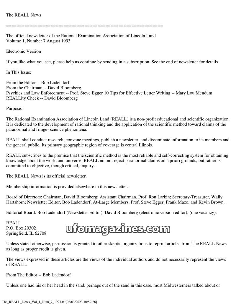 This issue of The REALL News, from August 1993, focuses on skepticism and critical inquiry. Editor Bob Ladendorf discusses the unity shown during the Great Flood and the absence of
