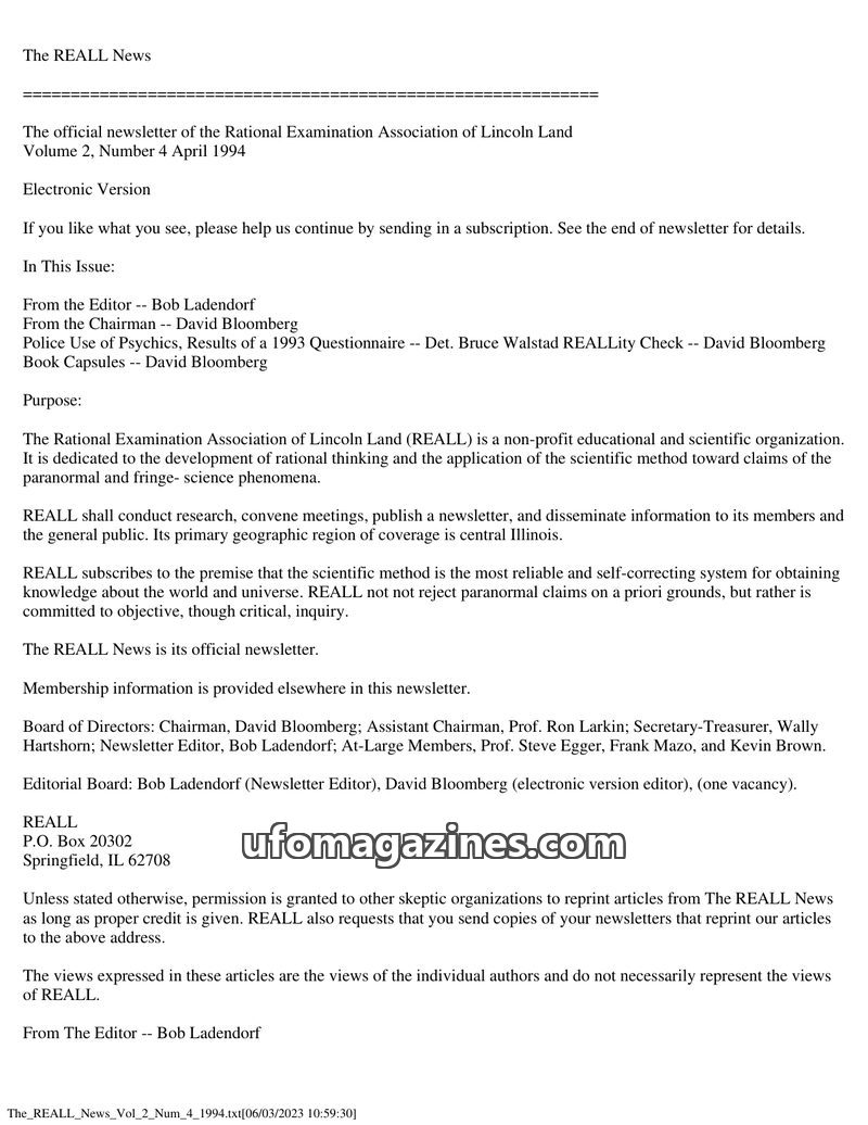 This issue of The REALL News, published in April 1994, focuses on skepticism and critical inquiry. A key article by Det. Bruce Walstad presents results from a 1993 questionnaire on