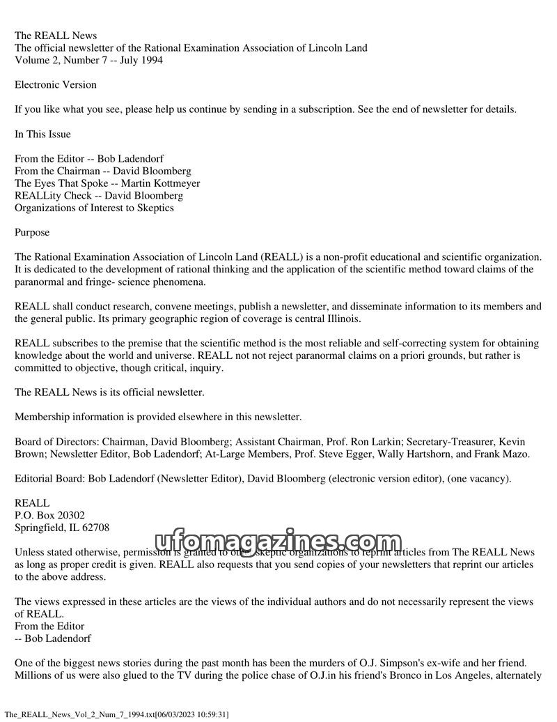 This issue of The REALL News, published in July 1994, focuses on skepticism and the scientific method. Martin Kottmeyer's article "The Eyes That Spoke" explores how the imagery of