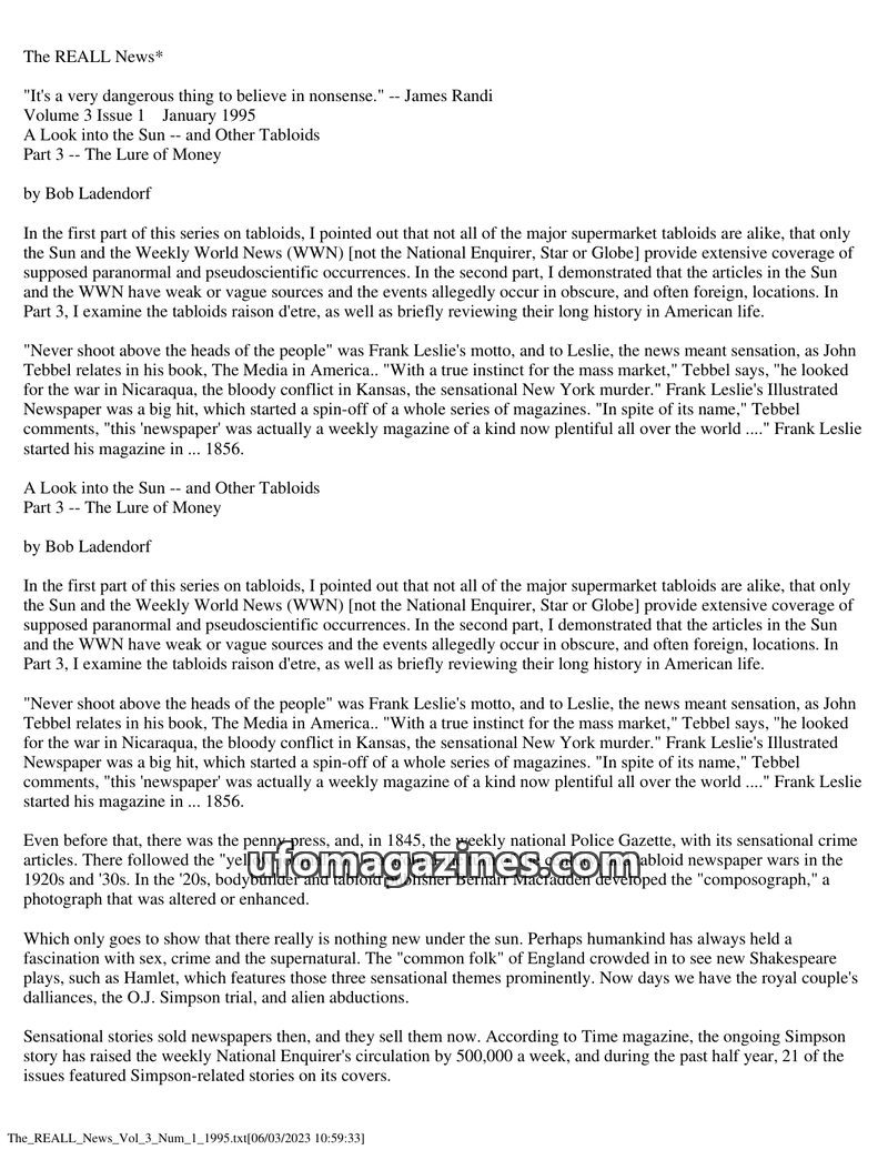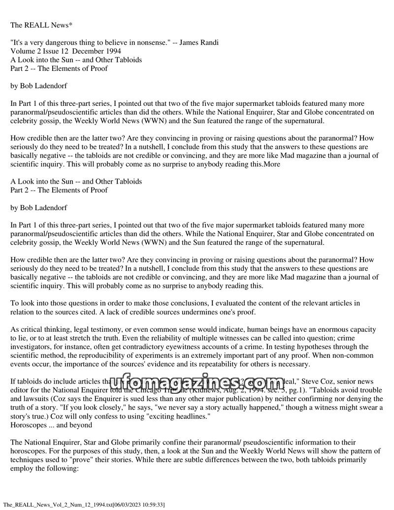 This issue of The REALL News critically examines the credibility of supermarket tabloids, specifically The Sun and Weekly World News, in their reporting of paranormal and pseudosci