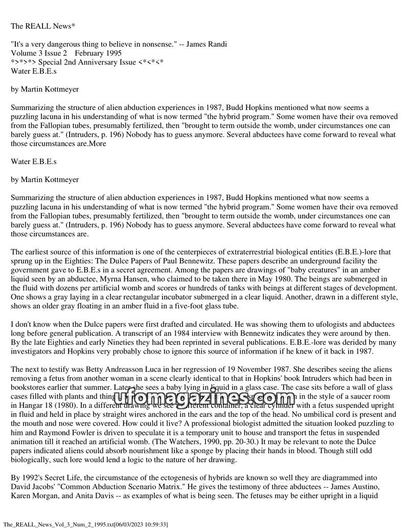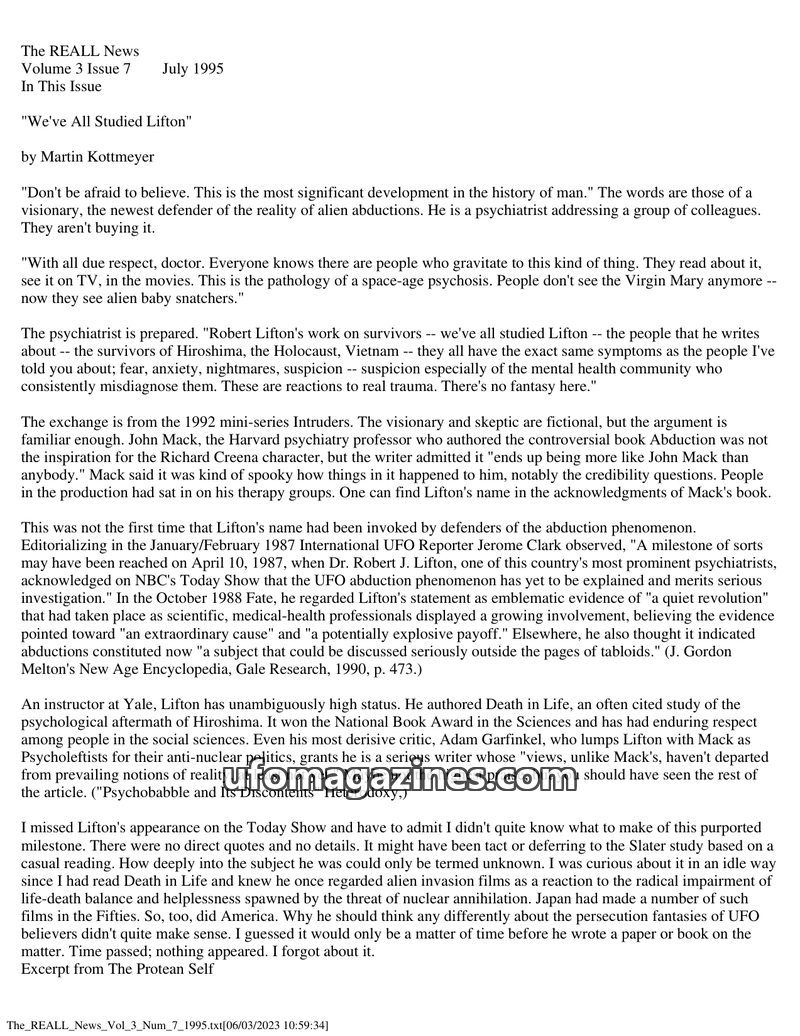 This issue of The REALL News features an article by Martin Kottmeyer analyzing psychiatrist Robert Lifton's perspective on alien abductions, comparing it to skeptical arguments and