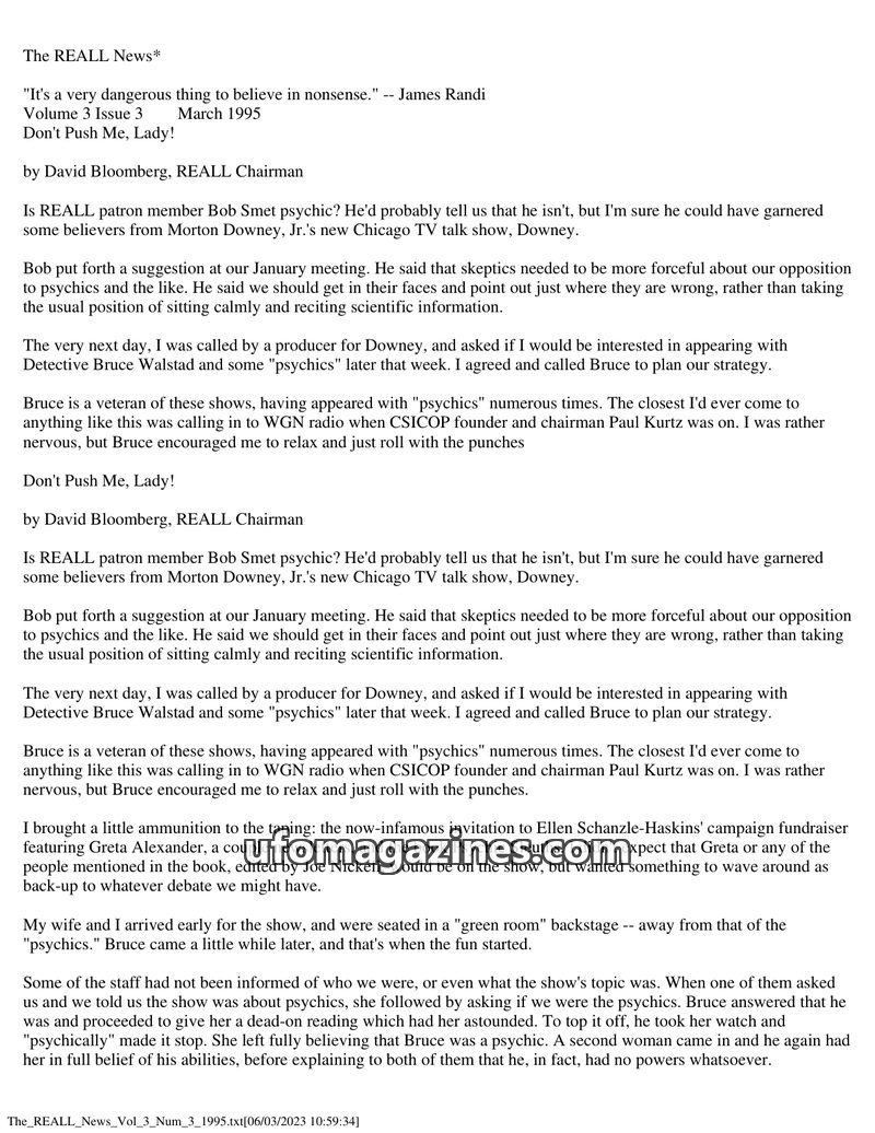 This issue details REALL Chairman David Bloomberg's appearance on the Morton Downey Jr. talk show to debate psychics. He and Detective Bruce Walstad employed a confrontational skep