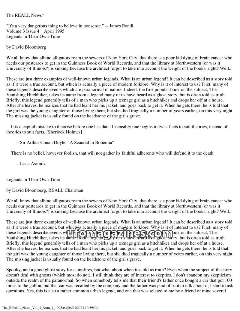 This issue of The REALL News, published in April 1995, focuses on urban legends and how they spread as modern folklore, often presented as truth. Author David Bloomberg examines se