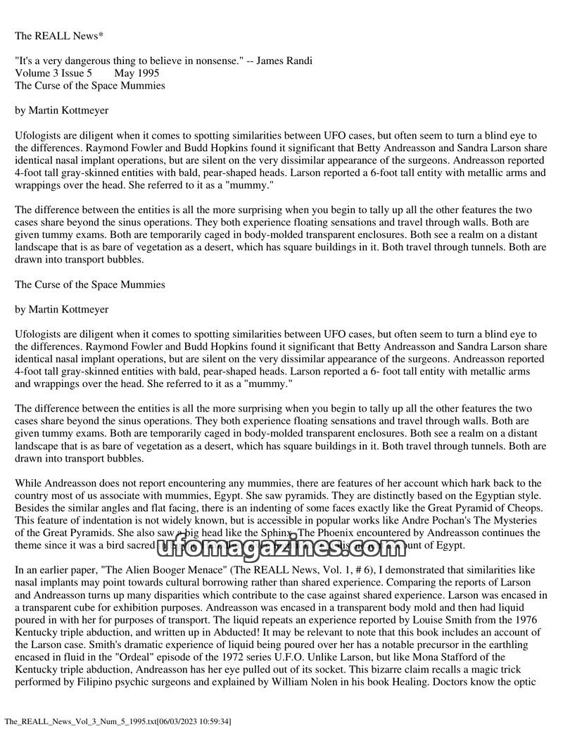 This issue critically examines UFO abduction accounts, particularly the Betty Andreasson and Sandra Larson cases, by comparing their reported similarities and differences. Author M