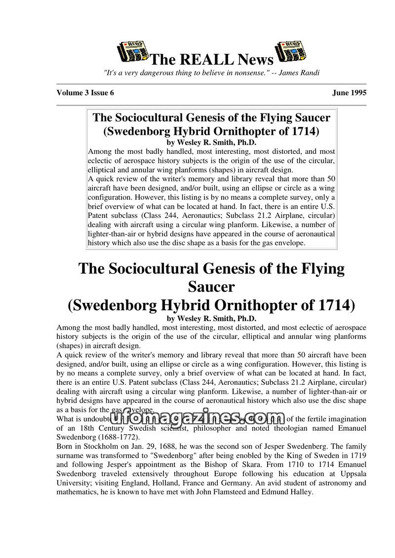 This issue of The REALL News features an article by Wesley R. Smith, Ph.D., on Emanuel Swedenborg's 1714 'Flying Saucer' design, an ornithopter with circular, elliptical, or annula