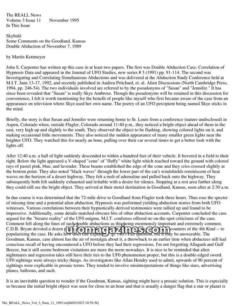This issue of The REALL News features an analysis of the Goodland, Kansas Double Abduction case by Martin Kottmeyer, who suggests prosaic explanations involving Jupiter and a corn