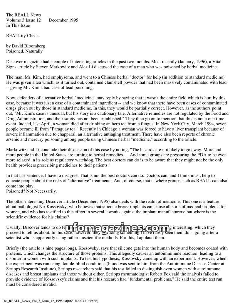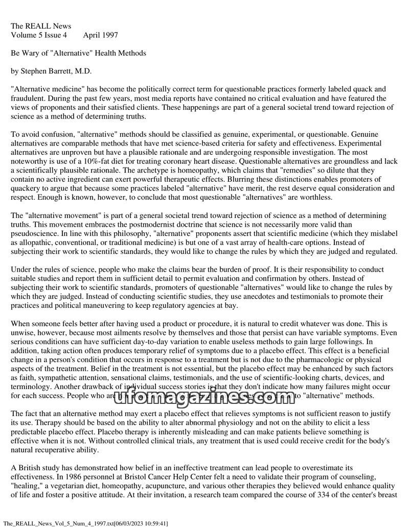 This issue of The REALL News features an article by Stephen Barrett, M.D., cautioning readers about "alternative" health methods, distinguishing between genuine, experimental, and