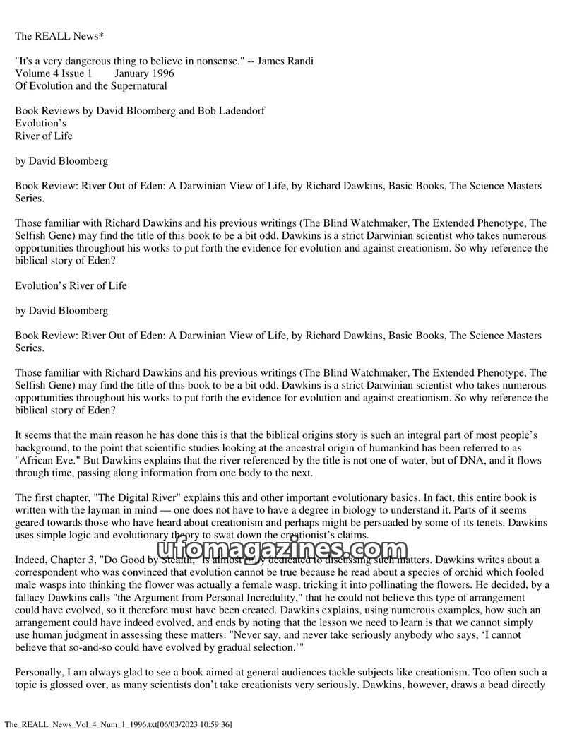 This issue features reviews of two books: Richard Dawkins' 'River Out of Eden,' which argues for evolution and against creationism using Darwinian principles, and James Randi's 'An