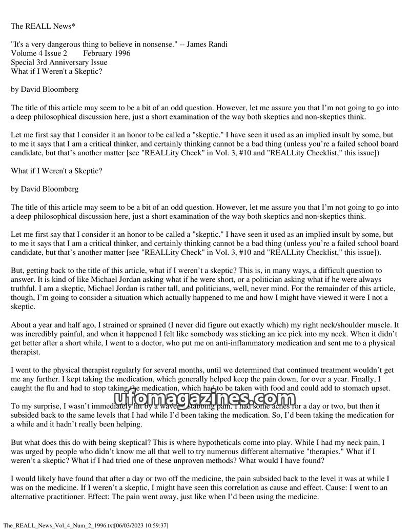 This issue of The REALL News features an article by David Bloomberg discussing the importance of skepticism and critical thinking, using a personal anecdote about neck pain to illu
