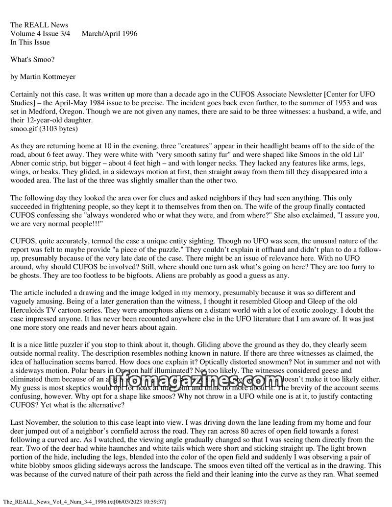 This issue of The REALL News features an article by Martin Kottmeyer analyzing a 1953 'Smoo' creature sighting in Oregon, proposing it was a misidentification of deer. Editorials b