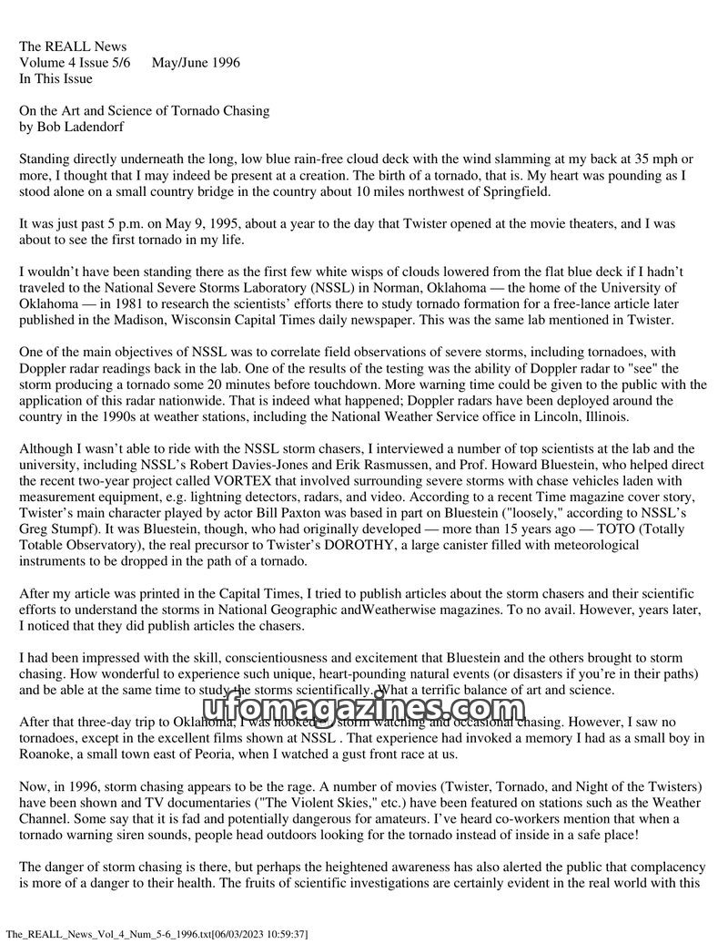 This issue of The REALL News features an in-depth look at tornado chasing, including a personal account of witnessing a tornado formation and the scientific efforts to understand s