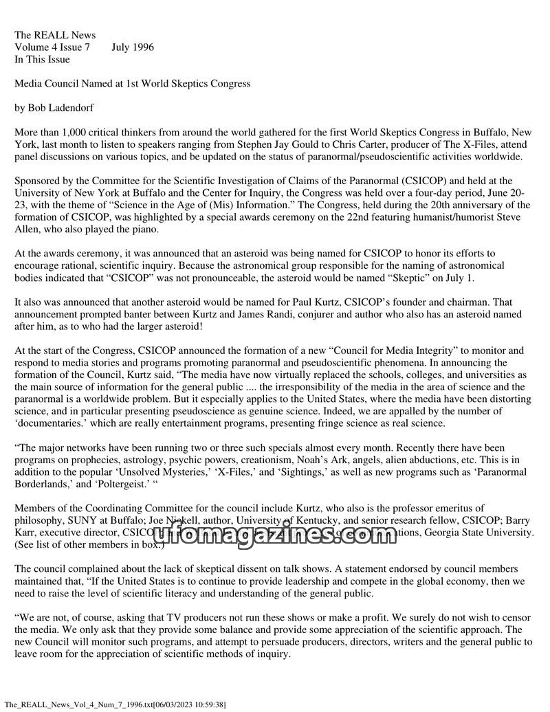 The July 1996 issue of The REALL News reports on the 1st World Skeptics Congress in Buffalo, NY, where the Committee for the Scientific Investigation of Claims of the Paranormal (C