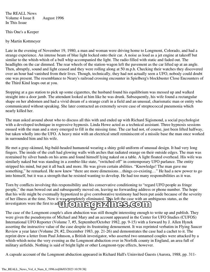 This issue of The REALL News features an in-depth analysis of the 1980 Longmont, Colorado, abduction case, exploring its similarities to the science fiction show 'The Outer Limits'