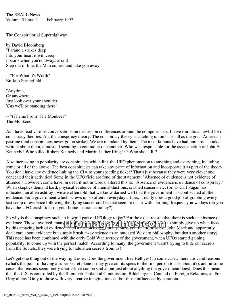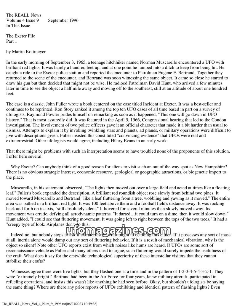This issue of The REALL News features the first part of Martin Kottmeyer's analysis of the 1965 Exeter UFO incident, detailing the encounter of Norman Muscarello and police officer