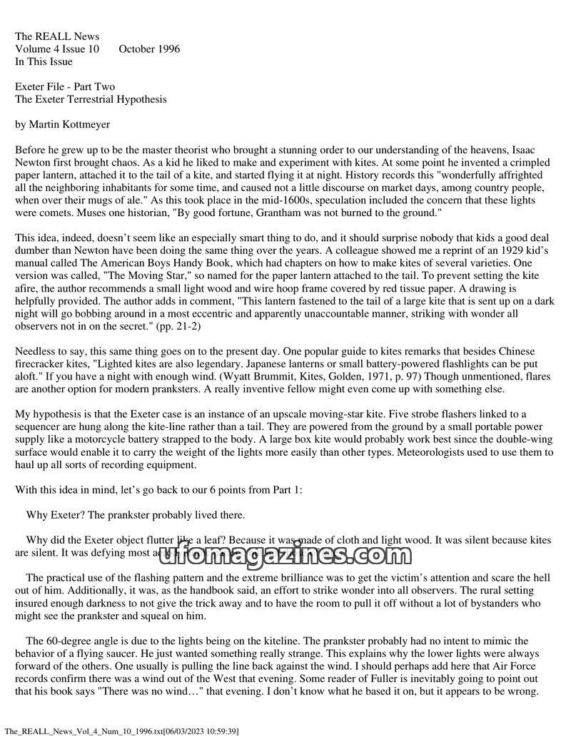 This issue of The REALL News features Martin Kottmeyer's hypothesis that the Exeter UFO incident was a sophisticated kite prank, drawing parallels to historical kite experiments an