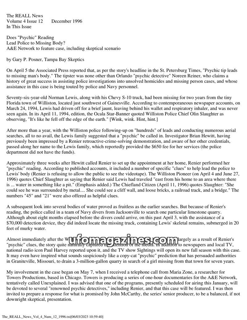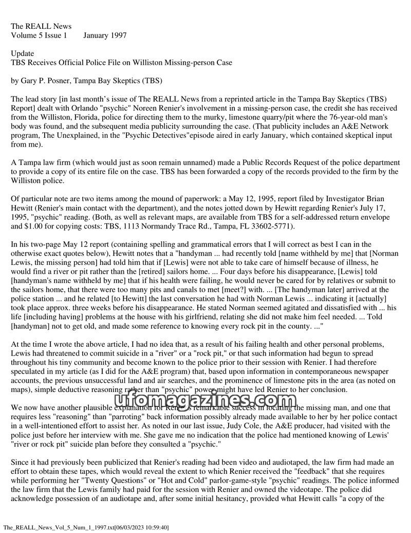 This issue of The REALL News investigates the Williston missing person case, questioning the role of psychic Noreen Renier and examining police records obtained by the Tampa Bay Sk