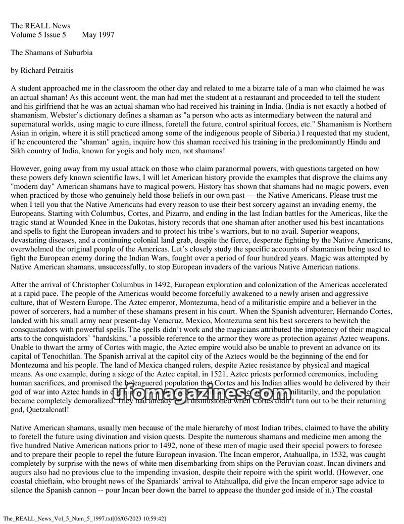 This issue of The REALL News critically examines claims of shamanism, arguing that historical attempts by Native Americans to use magic against European invaders were unsuccessful
