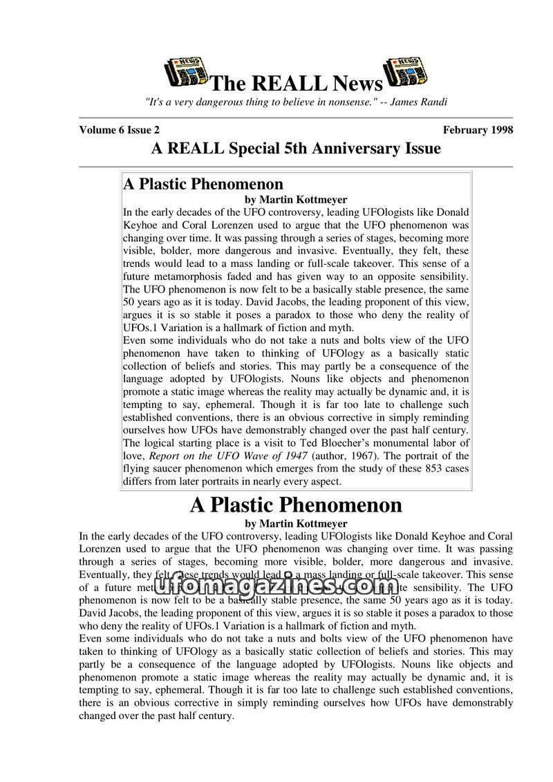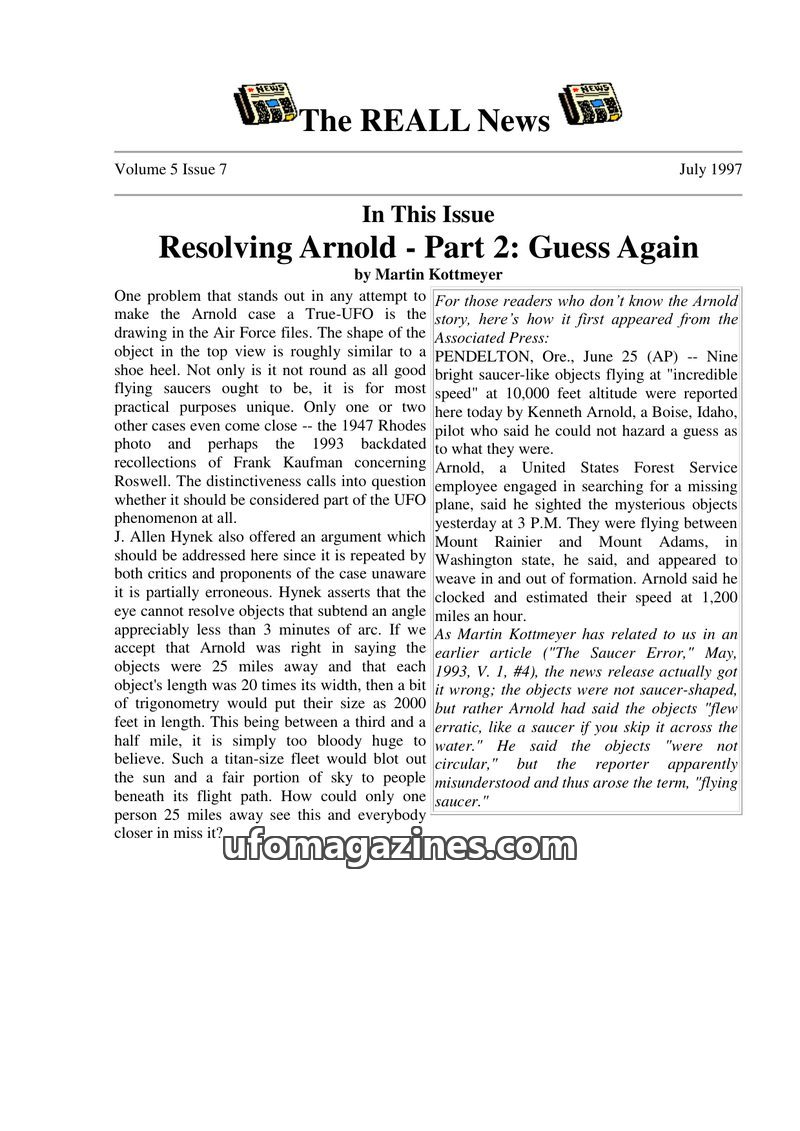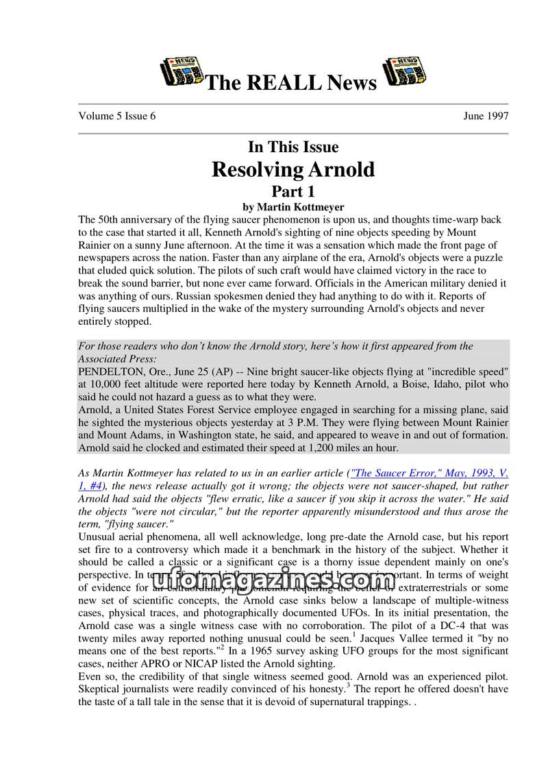 This issue of The REALL News focuses on the 50th anniversary of the Kenneth Arnold UFO sighting, examining its historical significance and presenting various skeptical explanations