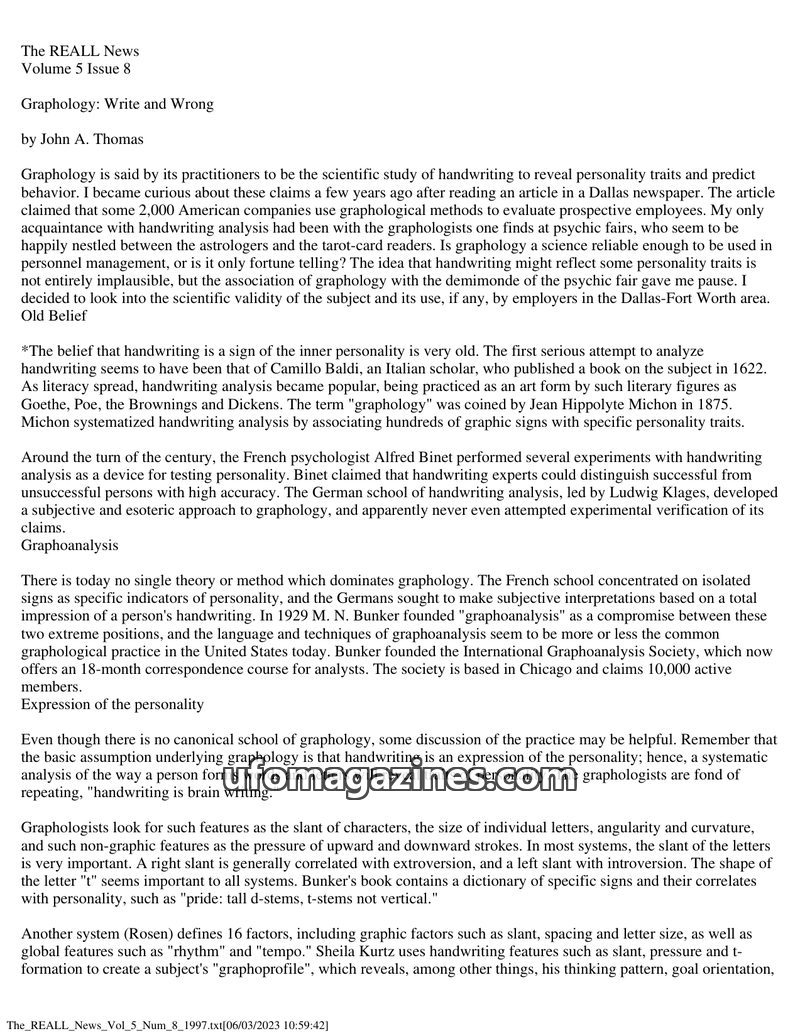 This article critically examines graphology, the study of handwriting for personality assessment. It traces the history of graphology from early beliefs to modern practices like gr