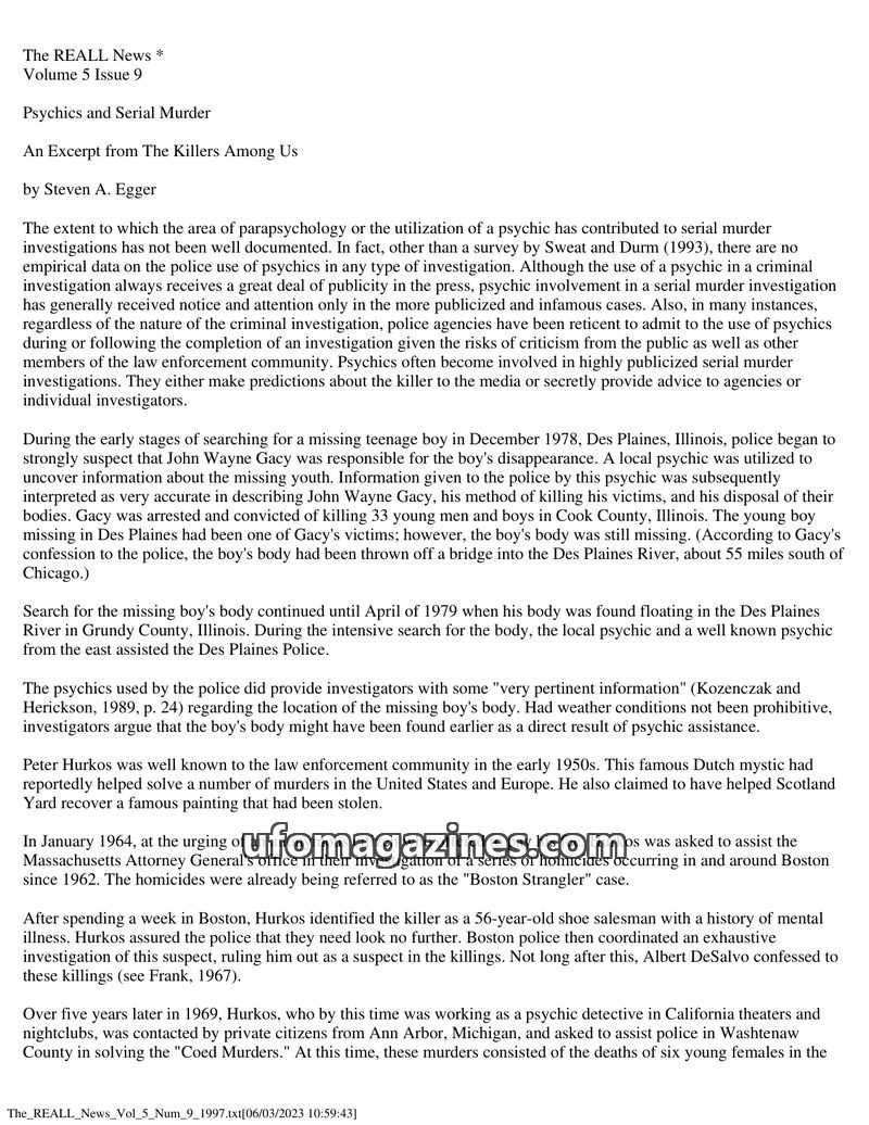 This issue of The REALL News examines the controversial use of psychics in serial murder investigations, featuring an excerpt from Steven A. Egger's book 'The Killers Among Us'. Th
