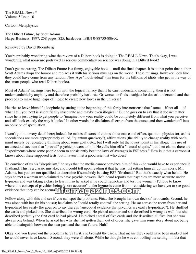 This issue of The REALL News features a critical review of Scott Adams' book 'The Dilbert Future,' particularly its final chapter which delves into New Age and psychic claims. The