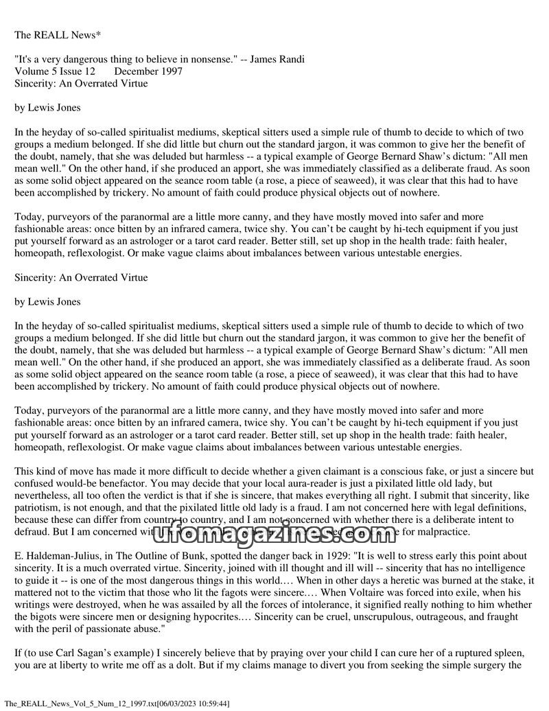 This issue of The REALL News features an article by Lewis Jones titled 'Sincerity: An Overrated Virtue.' Jones argues that sincerity, while often used to excuse fraudulent or misgu