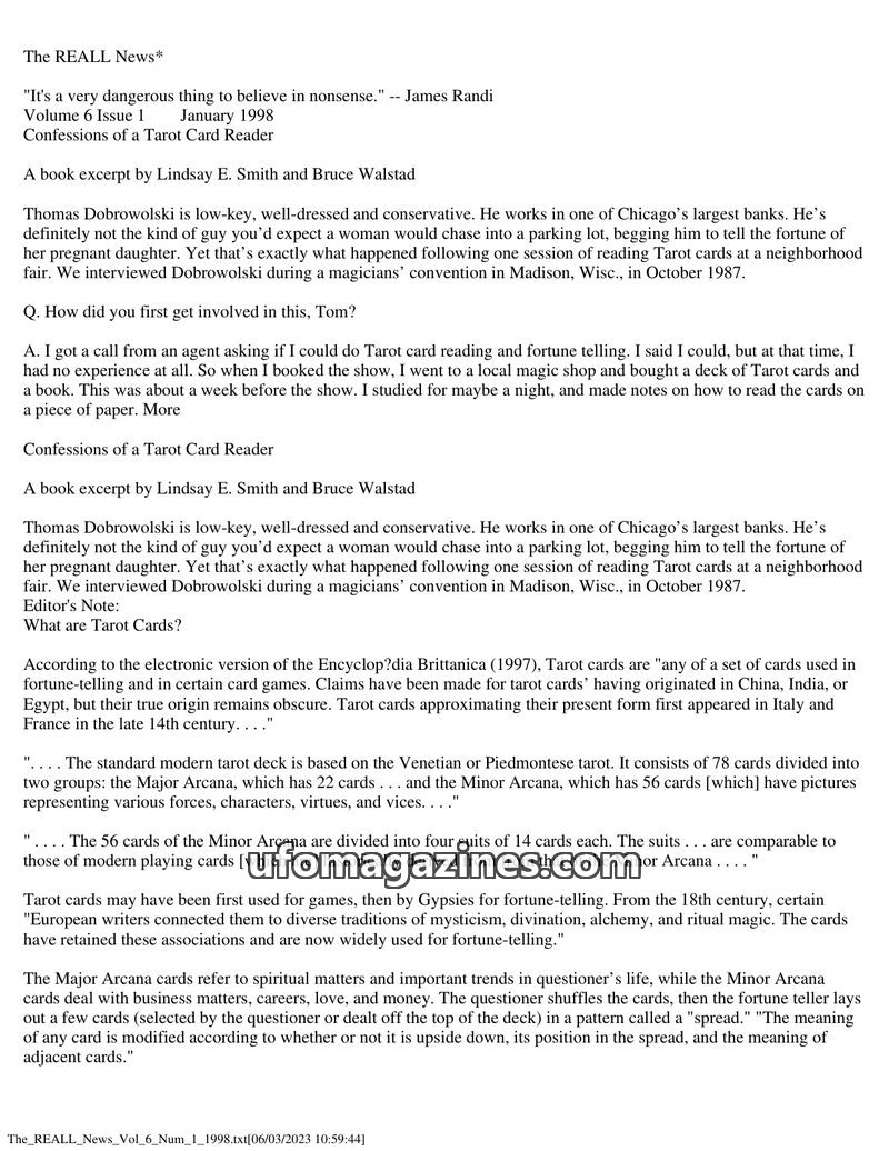 This issue features an excerpt detailing Thomas Dobrowolski's experiences as a Tarot card reader, including his initial lack of experience and reliance on cold reading techniques.