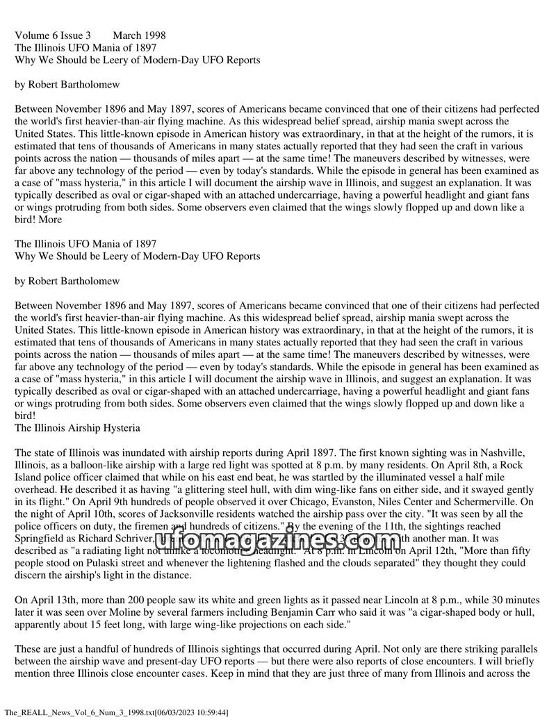 The article details the 'Illinois UFO Mania of 1897,' a period between November 1896 and May 1897 when thousands of Americans reported seeing airships. The phenomenon was particula