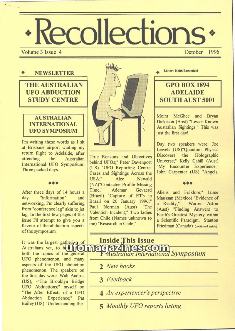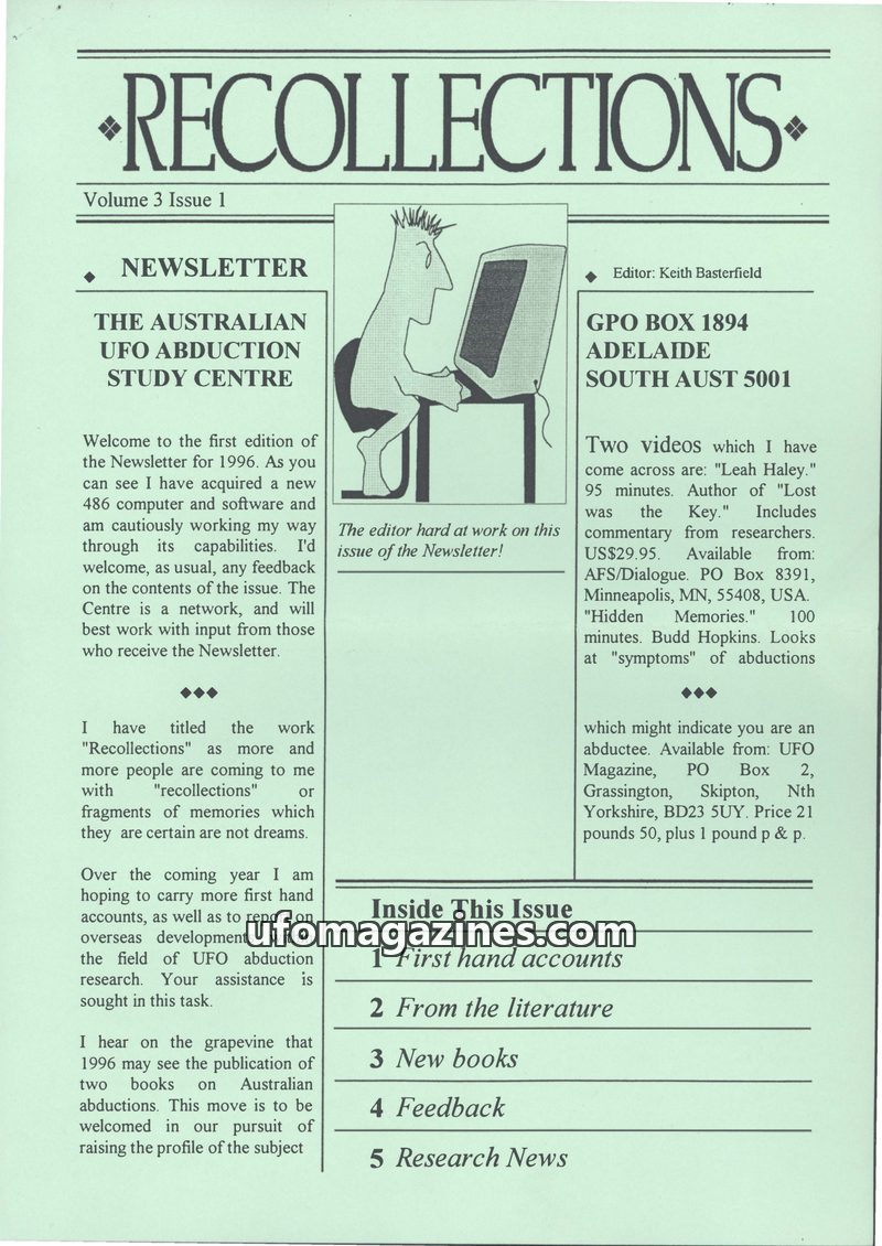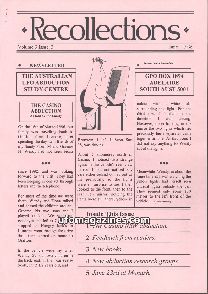 This issue of Recollections, the newsletter of the Australian UFO Abduction Study Centre, marks its first edition for 1996. It features a personal account from 'Warwick' detailing