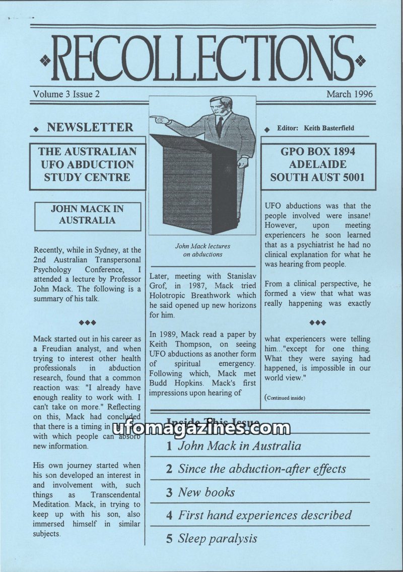 This issue of Recollections focuses on UFO abduction experiences, featuring a summary of Professor John Mack's lecture in Australia. It delves into the psychological aspects of abd