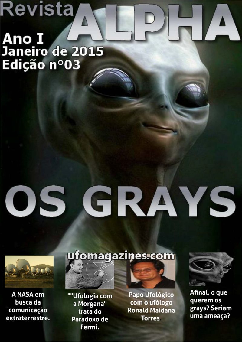 This issue of Revista ALPHA, dated January 2015, focuses on 'Os Grays,' exploring their characteristics and intentions based on abduction reports. It also features an article on NA